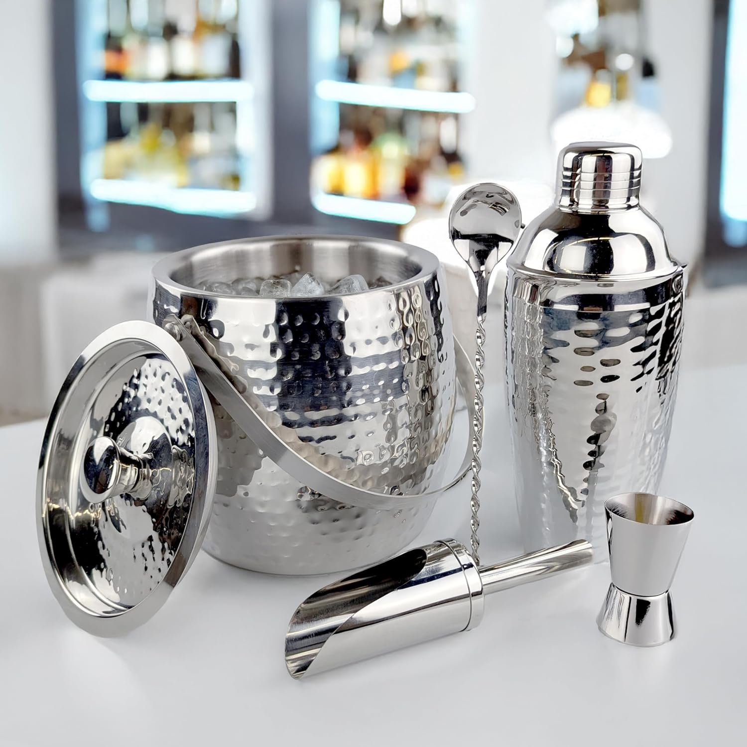 - Included Components : Ice Bucket, Scoop, Mixing Spoon, Cocktail Shaker, Lid, Strainer, Jigger