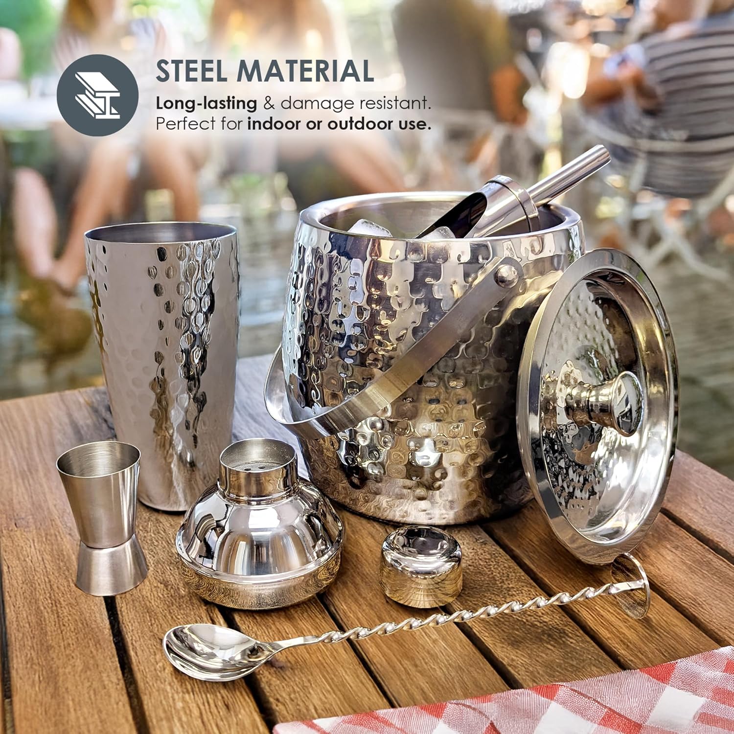- BAR ESSENTIALS FOR HOME: Durable bar kit that includes 3QT ice bucket + lid & scoop, cocktail shaker with strainer, cocktail spoon, & jigger - everything needed for mixing perfect cocktails at home.