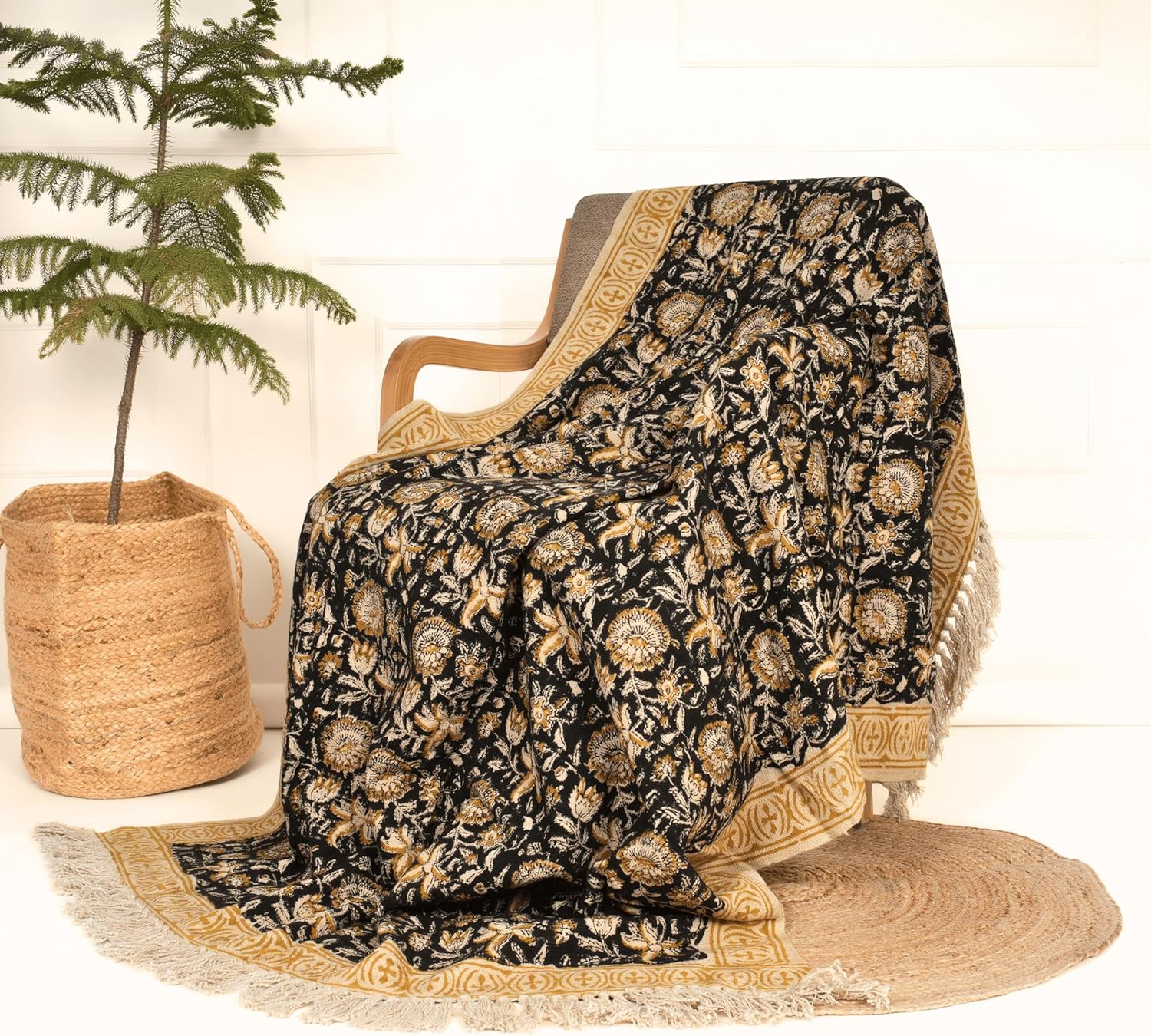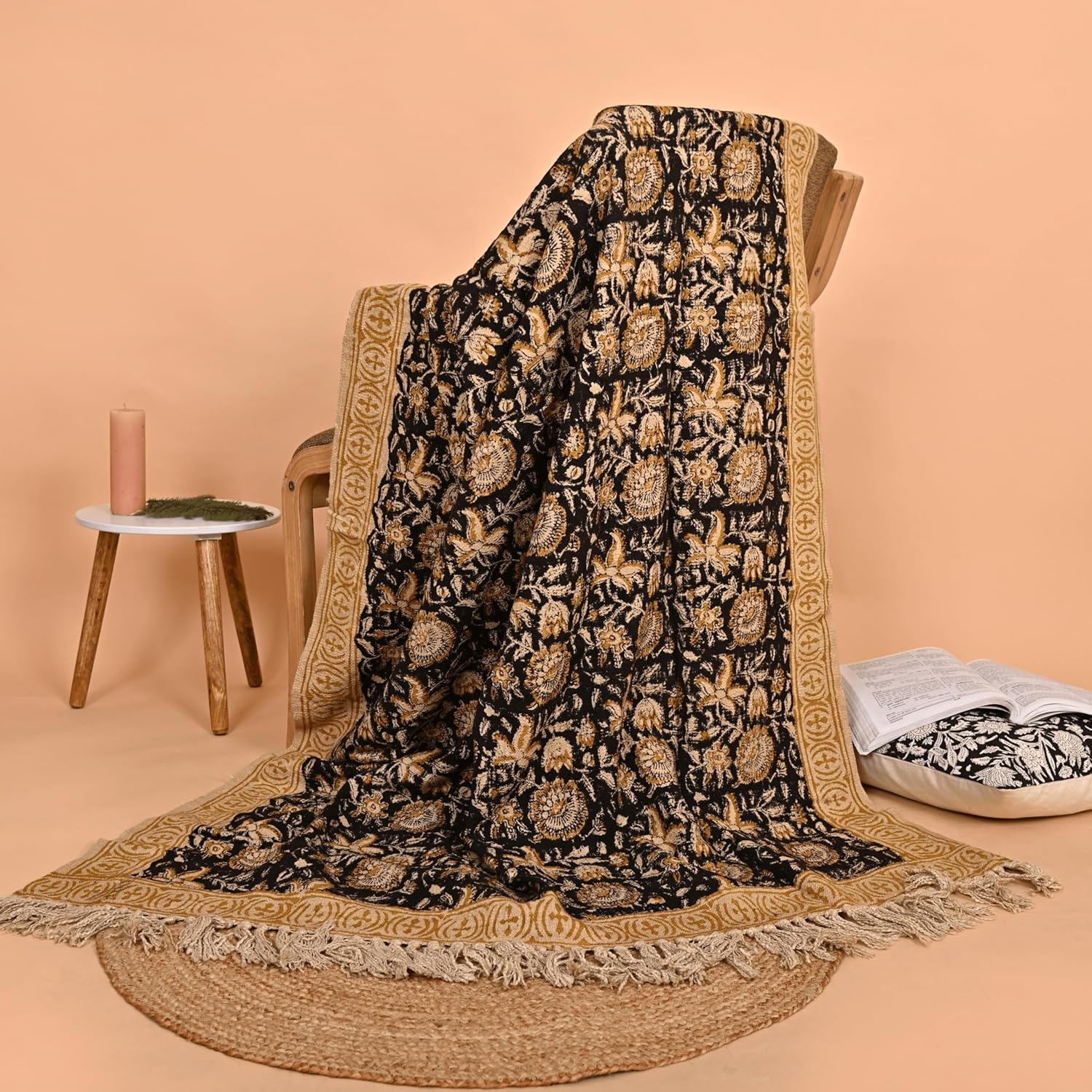 - Boho Charm with Handblock Floral Design: This SARVAA throw features an intricate handblock printed floral pattern in rich black and gold tones, perfect for adding warmth, depth, and personality to your space.