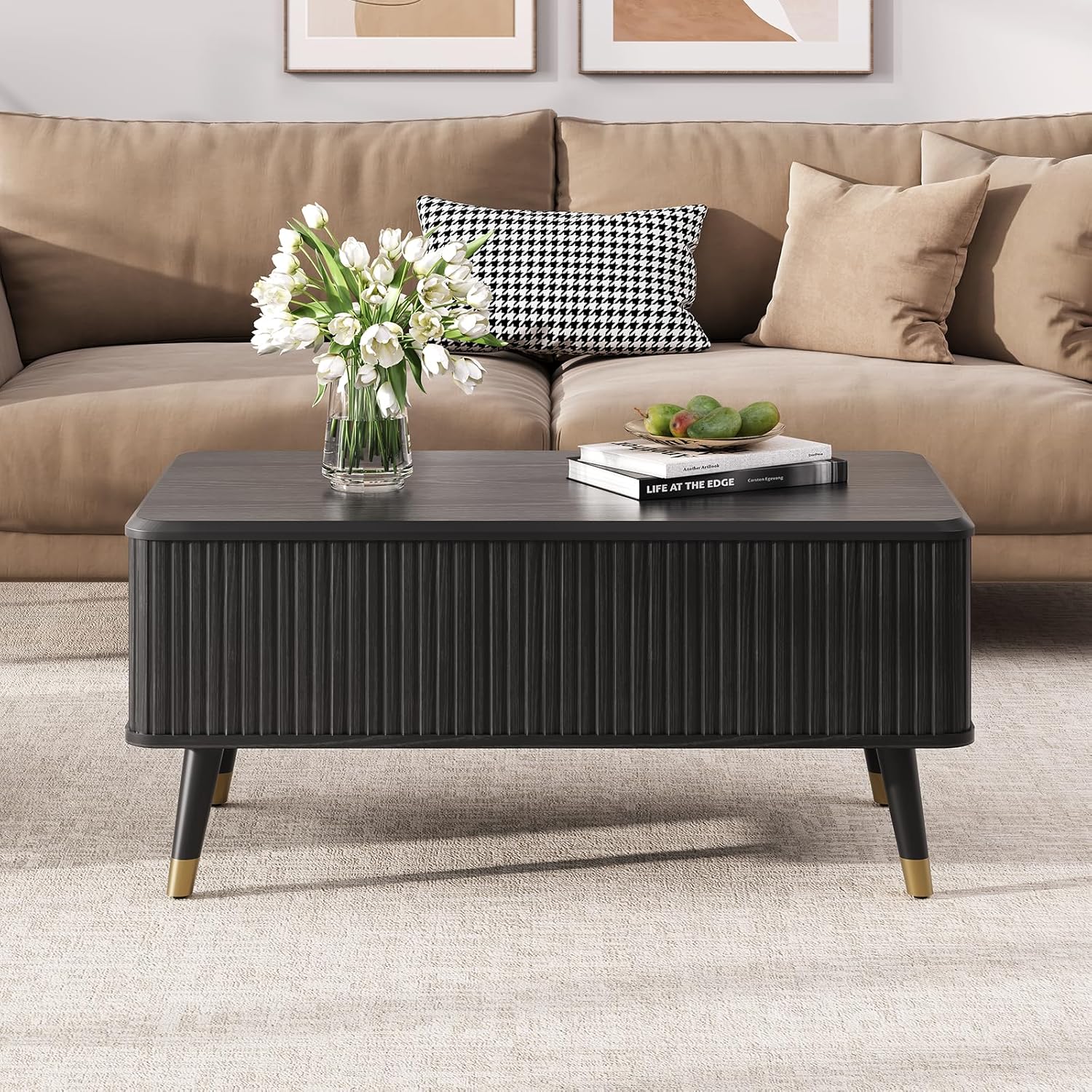 Lift Top Coffee Table with Storage Shelf & Hidden Compartment, Mid Century Modern Fluted Rectangle Dining Table for Living Room, Home Office,Black