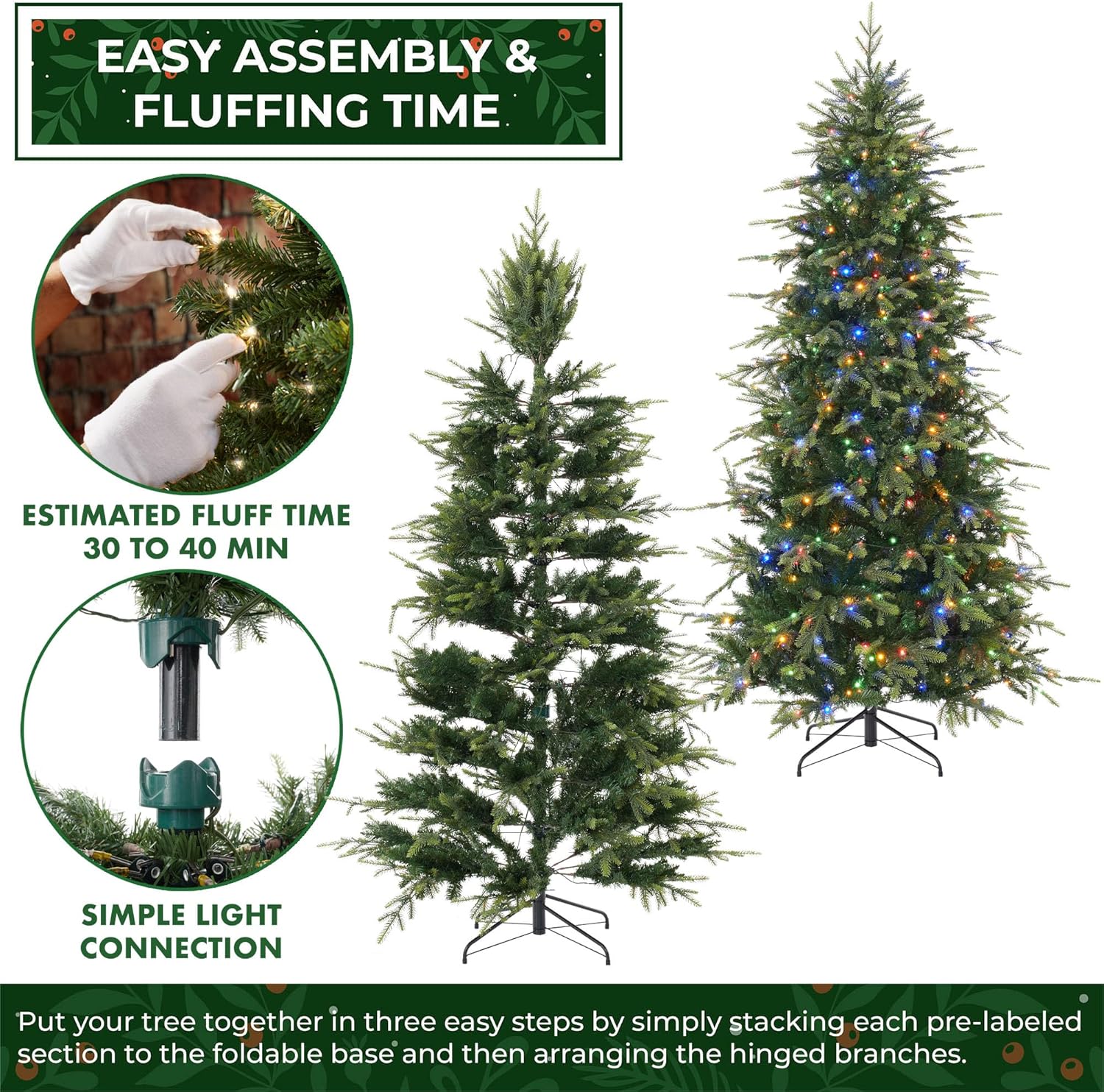 Casafield 6.5FT Pre-Lit Slim Green Aspen Fir Artificial Holiday Christmas Tree with White & Multicolored LED Lights, Realistic Noble Fir with Metal Stand