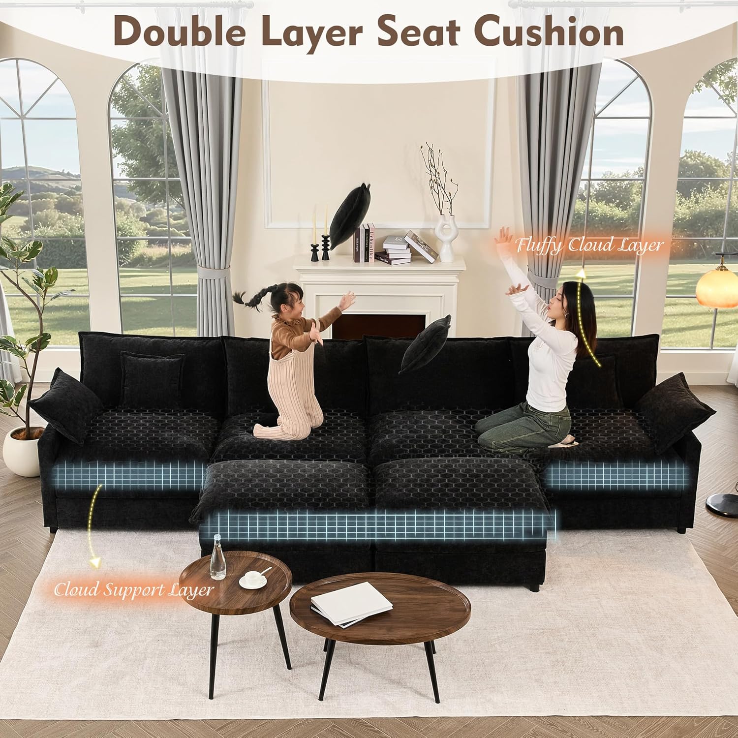 - Great Structural Rigidity: The sectional sofa features a sturdy steel frame and is equipped with high-quality double-layer foam cushions, offering superior comfort and support. It promotes healthy sitting posture, alleviates pressure on the lower back and muscles, and helps prevent discomfort and potential long-term health issues. With a length of 142.5 inches, this sofa is perfect for a family of 6