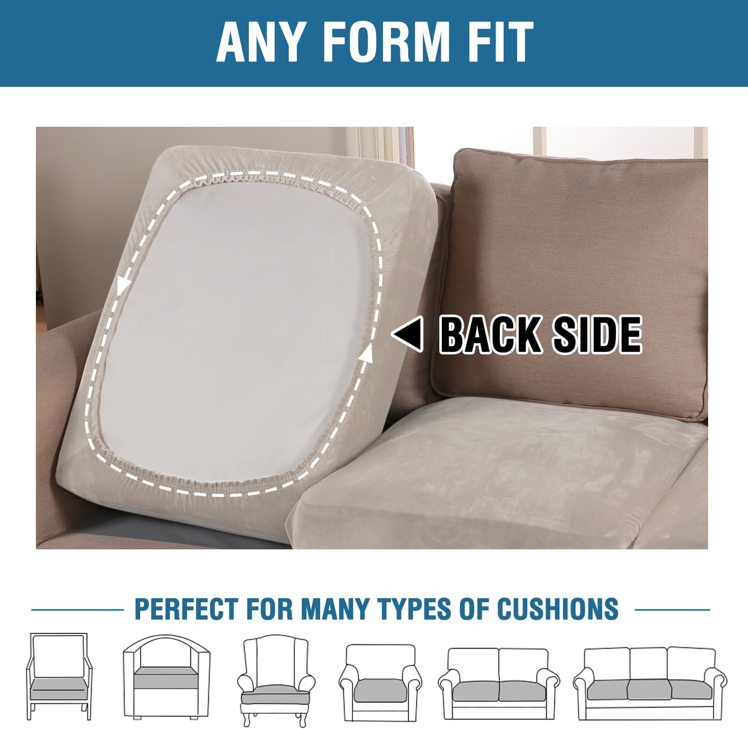 - ANY FORM FIT: Each cushion cover measures: 19.6-29.5" length, 21.6-30.5" width and 2-10" height. It's crafted from a unique extra stretchy fabric, perfect for regular square cushions, T-cushions and also L-cushions, used to cover not only the seat cushions of your sofa, but also the back cushions as long as they can be separated from the sofa