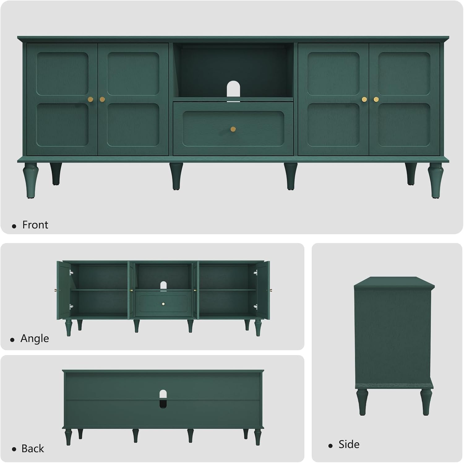 - ăMultiple Usesă: This green TV stand can be used as a Media Entertainment Center and a multifunctional storage cabinet. Its light design with clean lines and gold handles makes it a perfect addition to your living room, or anywhere else.