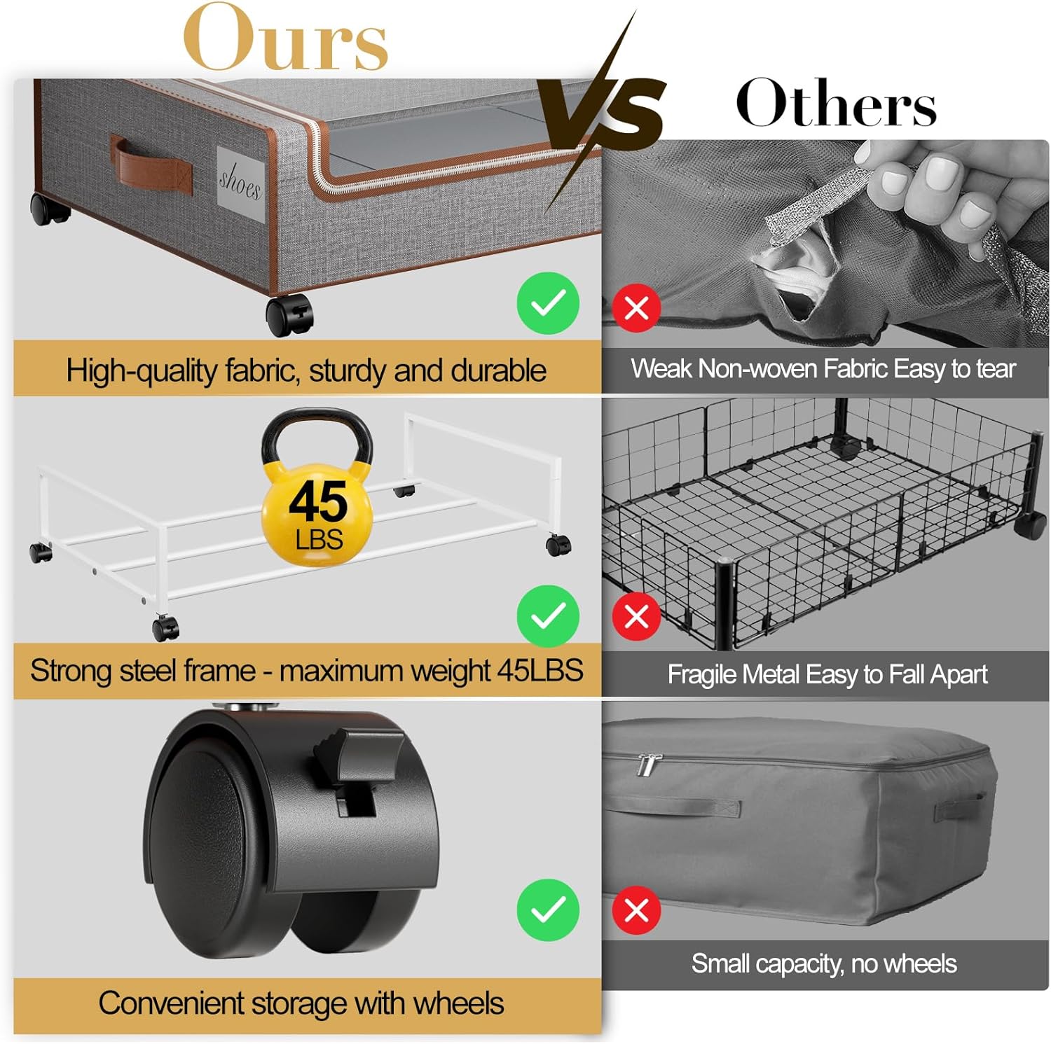 - 【360° Rotating Silent Wheels】Tired of lugging heavy storage boxes around? This under bed storage container features four smooth-gliding 360° rotating wheels, two of which include a locking function. Simply engage the locks with a gentle press to keep the unit securely in place when needed. Our rolling under bed storage bins effortlessly glide across hard floors and carpets, even when fully loaded
