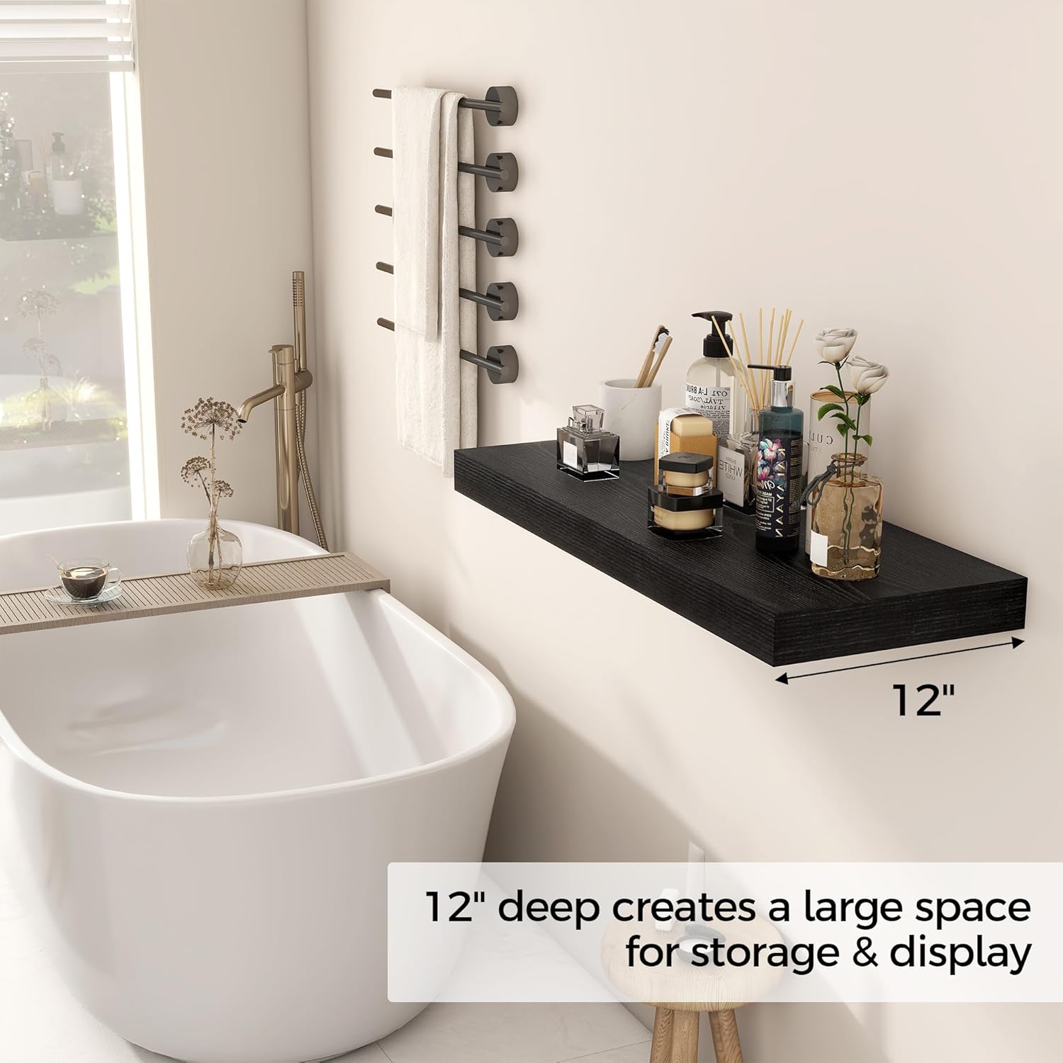 - ă12 INCH DEEP FLOATING SHELFăThis extra deeper and thicker wall shelves are 12 inches in depth and 2 inches in thickness instead of the regular narrow floating shelves, you can put photos, pictures, DVD players, videos, books, toys, and some other knickknack on this beautiful display wooden shelf.