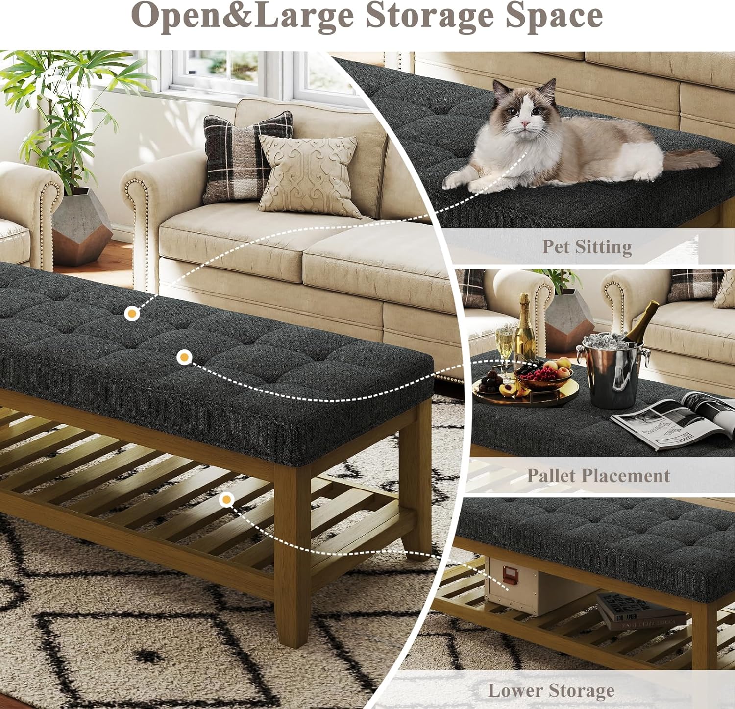 Large Rectangular Upholstered Ottoman Bench, Linen Tufted Footrest Ottoman with Solid Wood Shelf Storage Coffee Table for Bedroom Living Room, Dark Gary