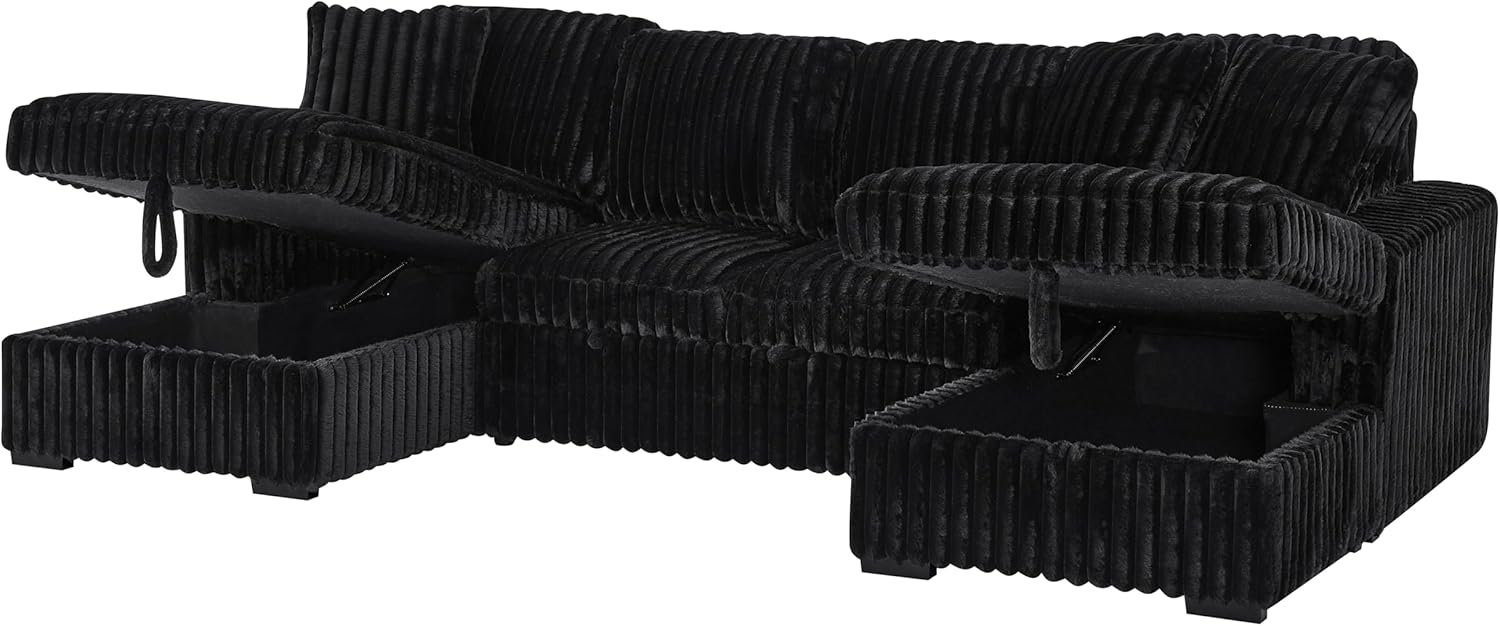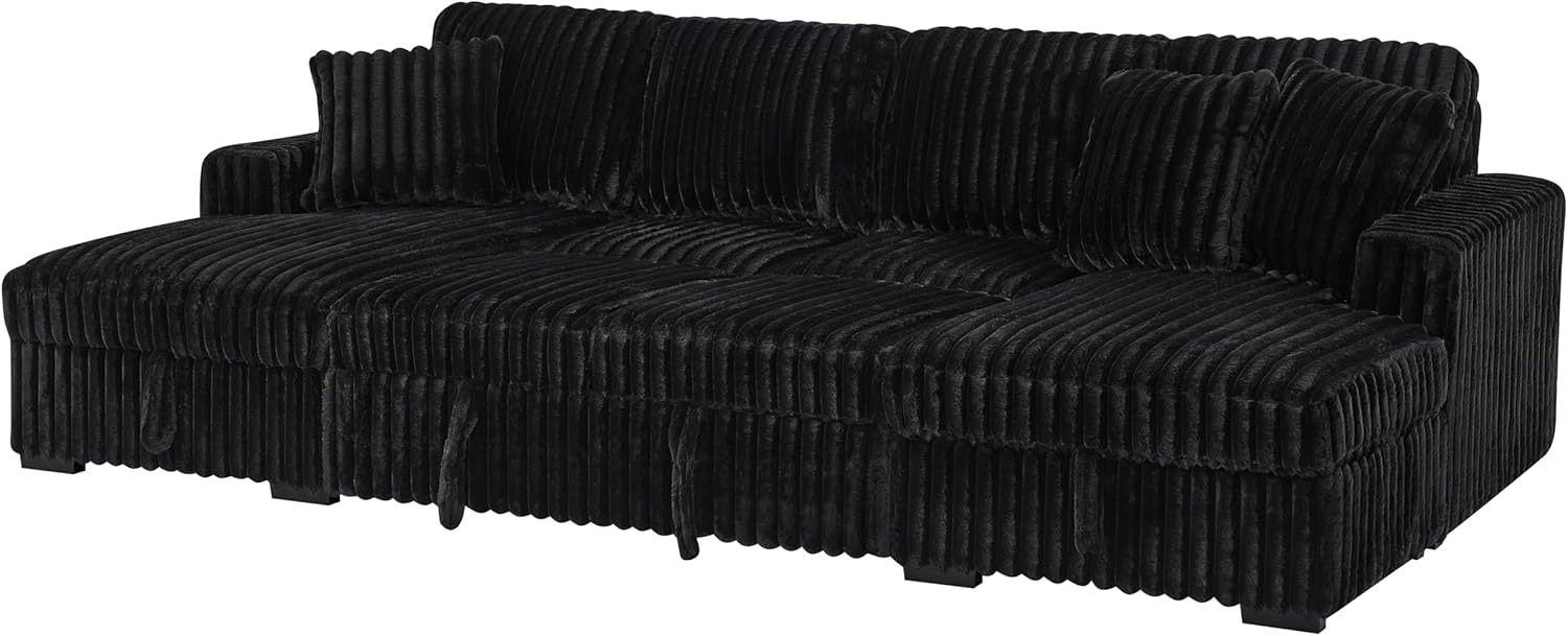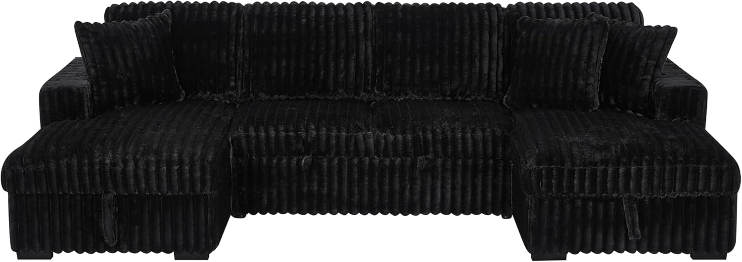 THSUPER Oversized U Shaped Plush Corduroy Fluffy Sectional Sleeper Sofa with Pull Out Bed and Double Storage Chaise for Living Room - Black