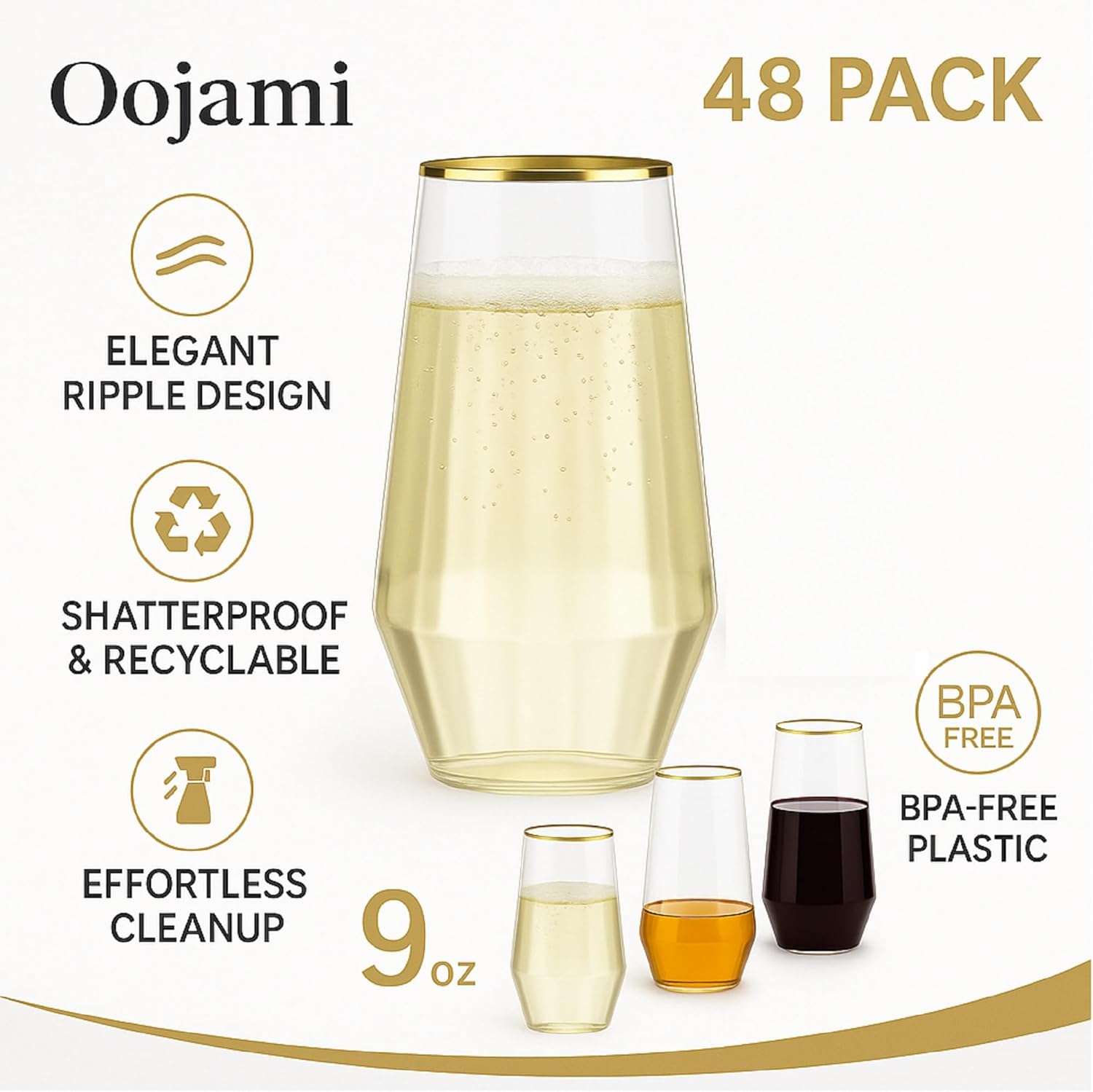 48 Pack Diamond Unbreakable Stemless Plastic Wine Stemless Toasting coacktail Glasses, Durable 9 Oz BPA-Free Disposable Champagne Flutes for Weddings, Bars, Events, and Celebrations (Diamond Gold Rim)