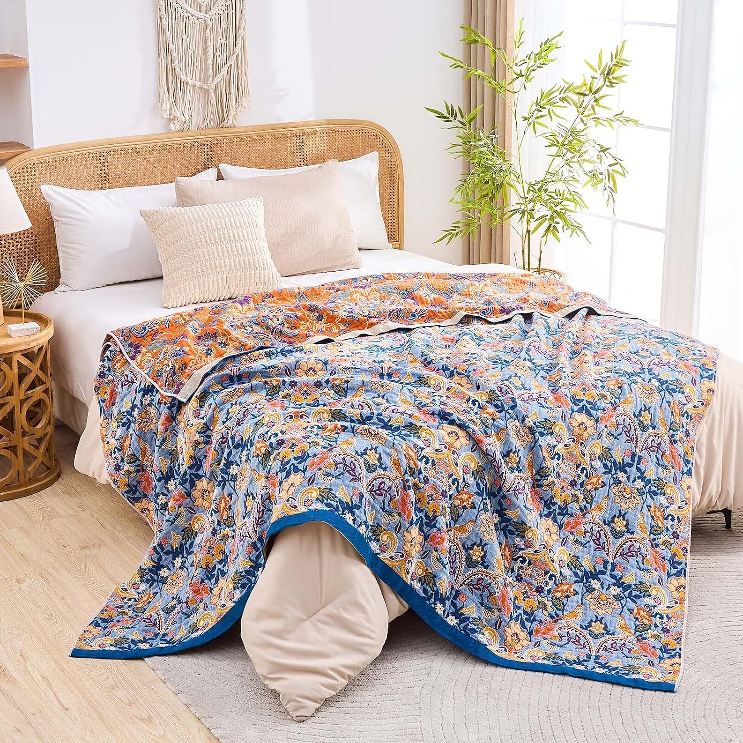 Boho Throw Blanket for Bed, 100% Cotton Soft Rustic Quilt Fall Blanket, 60"x80" Floral Printed Farmhouse Decor Bed Blankets, All Season Rustic Reversible Bohemian Throw Quilt