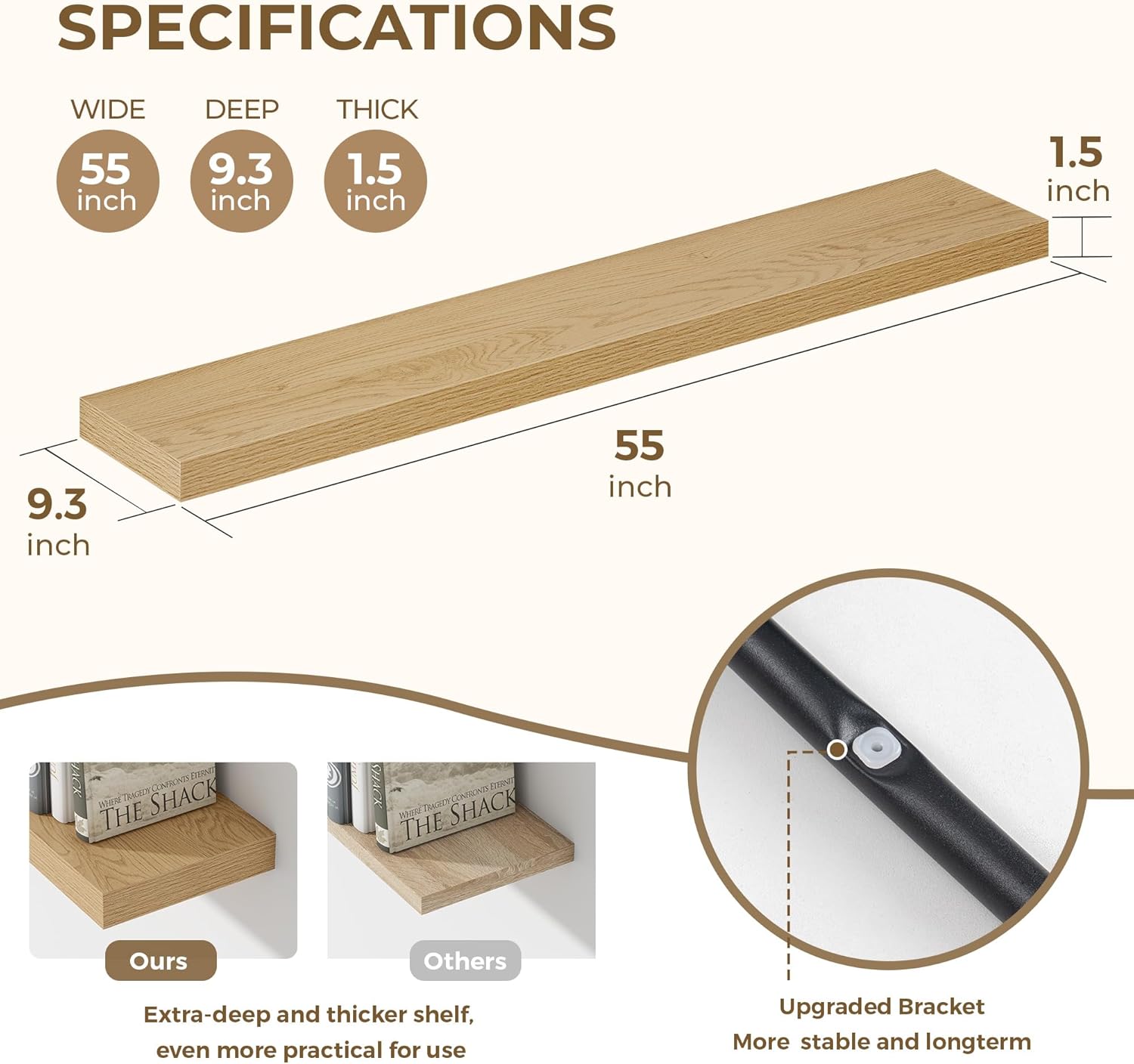 Dreamland 55 Inches Floating Shelves for Wall, 9.3" Deep Long Floating Shelves Set of 1, Large Display & Storage Shelf, Wall Shelf for Bathroom Bedroom Living Room Kitchen Office, Oak