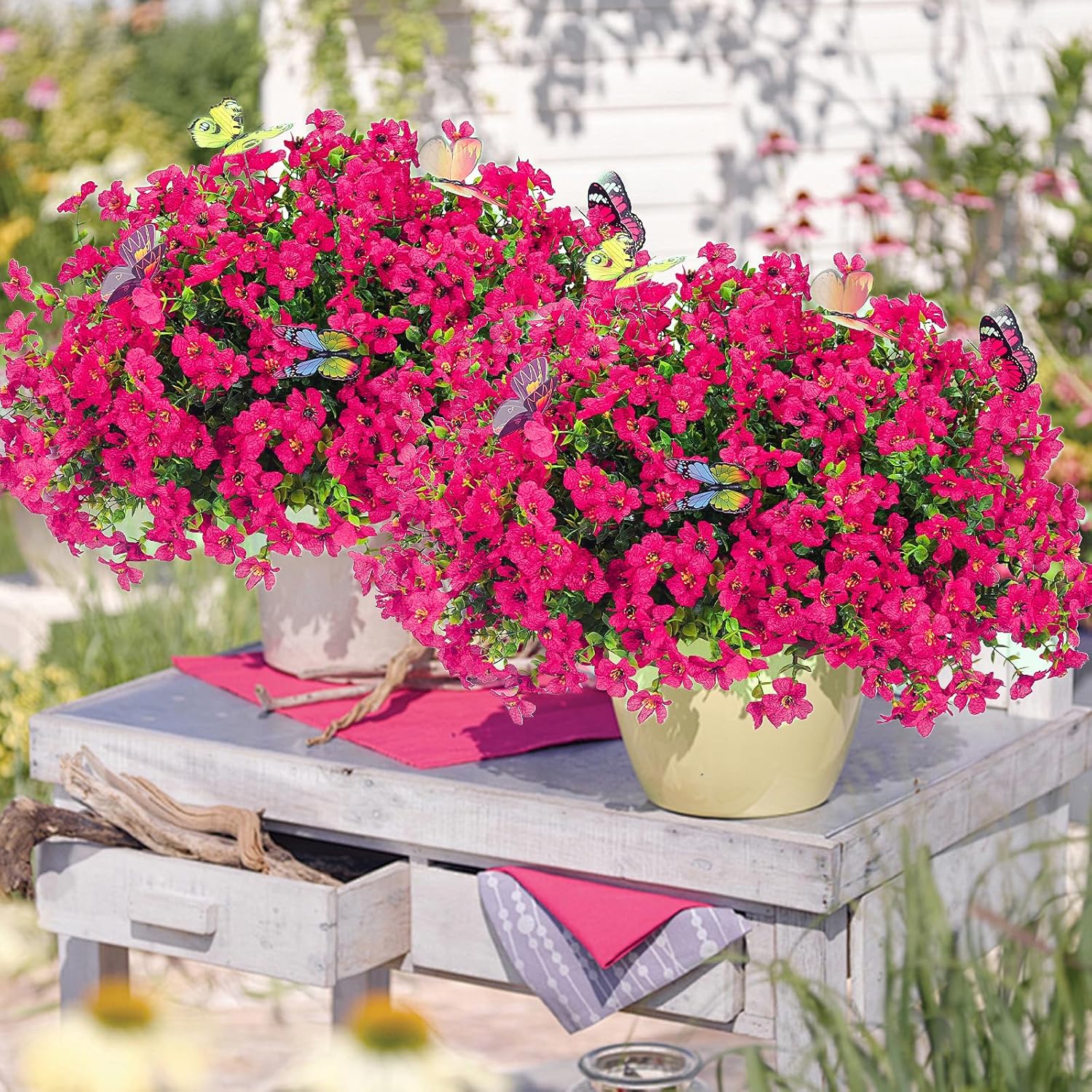 20 Bundles Artificial Flowers for Outdoors with 6 Faux Butterflies, UV Resistant Fake Flowers with Eucalyptus Leaves, Artificial Plants Outdoor for Patio Garden Porch Home Decor (Rose Red)
