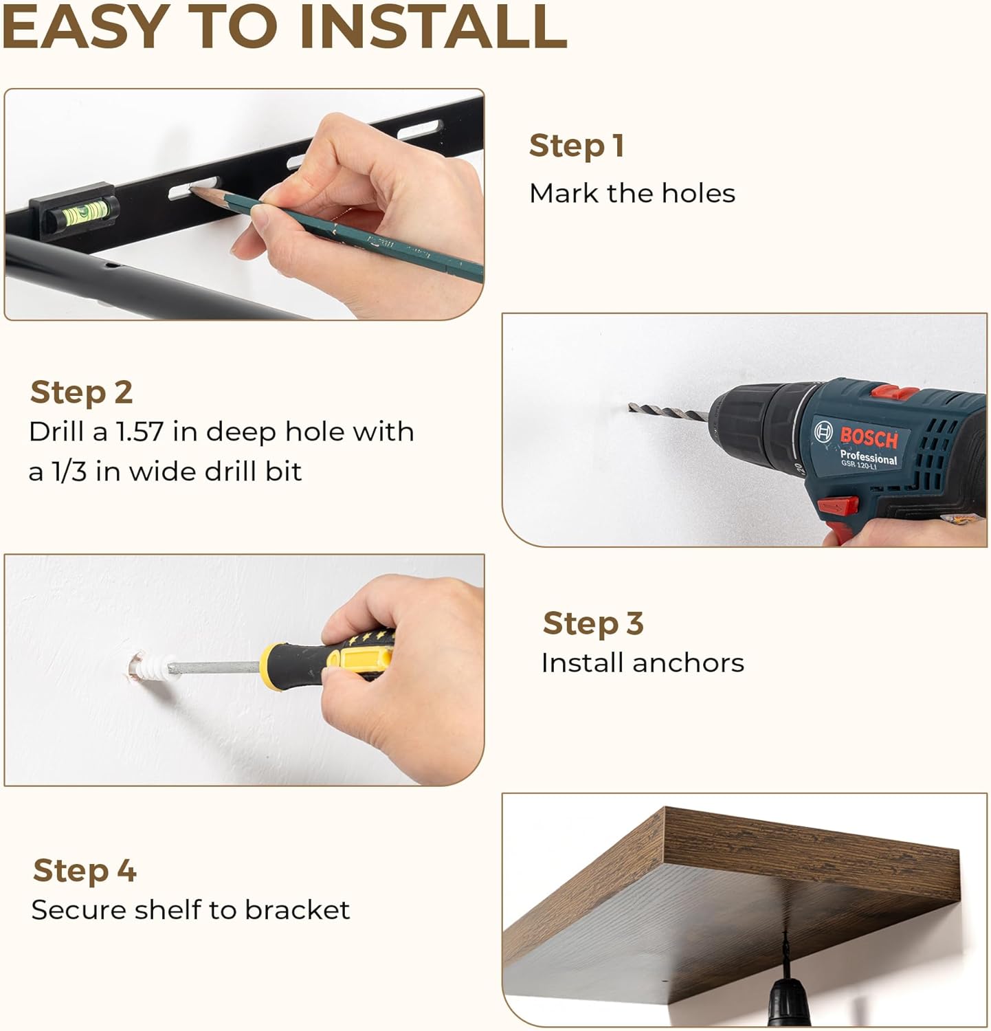 - Maximize Your Space: Perfect for small apartments, kitchens, and cozy living areas, these floating wall shelves help free up floor space while adding style. They create the illusion of a more open room, offering a smart way to display plants, collectibles, and dĂŠcor without compromising on space.