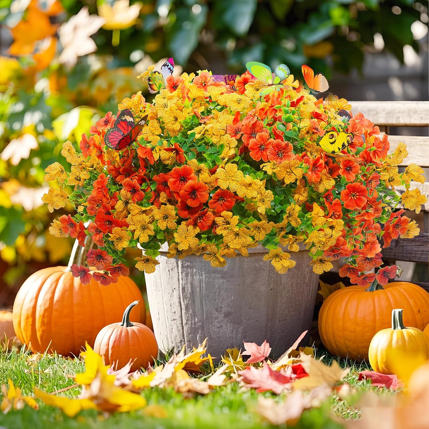 - Package Contents: This set includes 20 bundles of outdoor artificial flowers and 6 vivid faux butterflies(randomly color). Each fake outdoor plant features 7 flexible stems adorned with eucalyptus leaves and chrysanthemum blooms. Pot not included. (Yellow 10, Orange 10)
