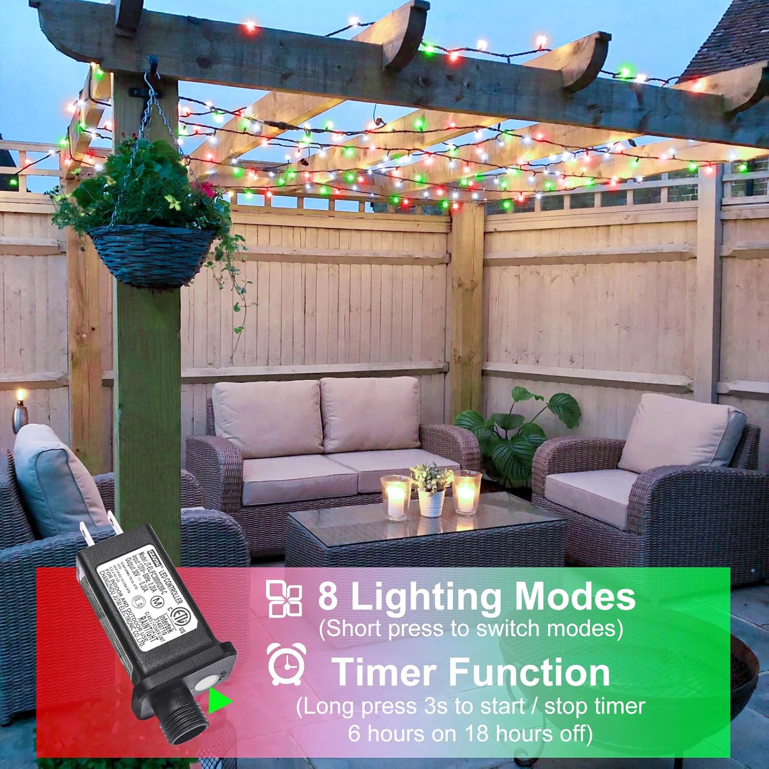 • Timer and Memory Function: Long press the button on the plug to activate timing function, 6 hours on and 18 hours off a day. Moreover, the built-in memory chip will intelligently remember your last settings without having to reset every time. Create a mesmerizing festive atmosphere for Christmas, Halloween, birthday, parties or weddings.
