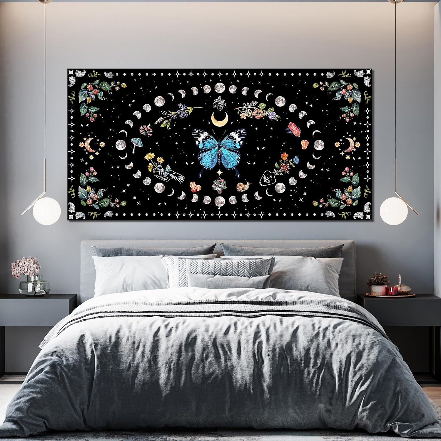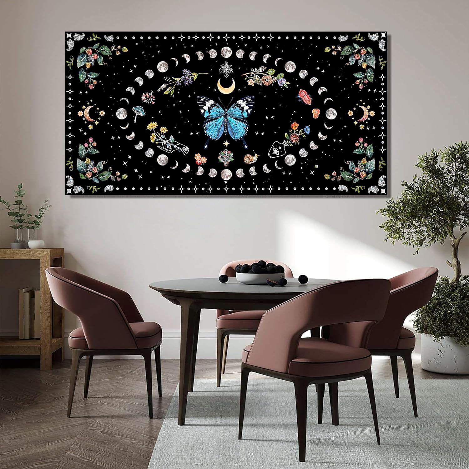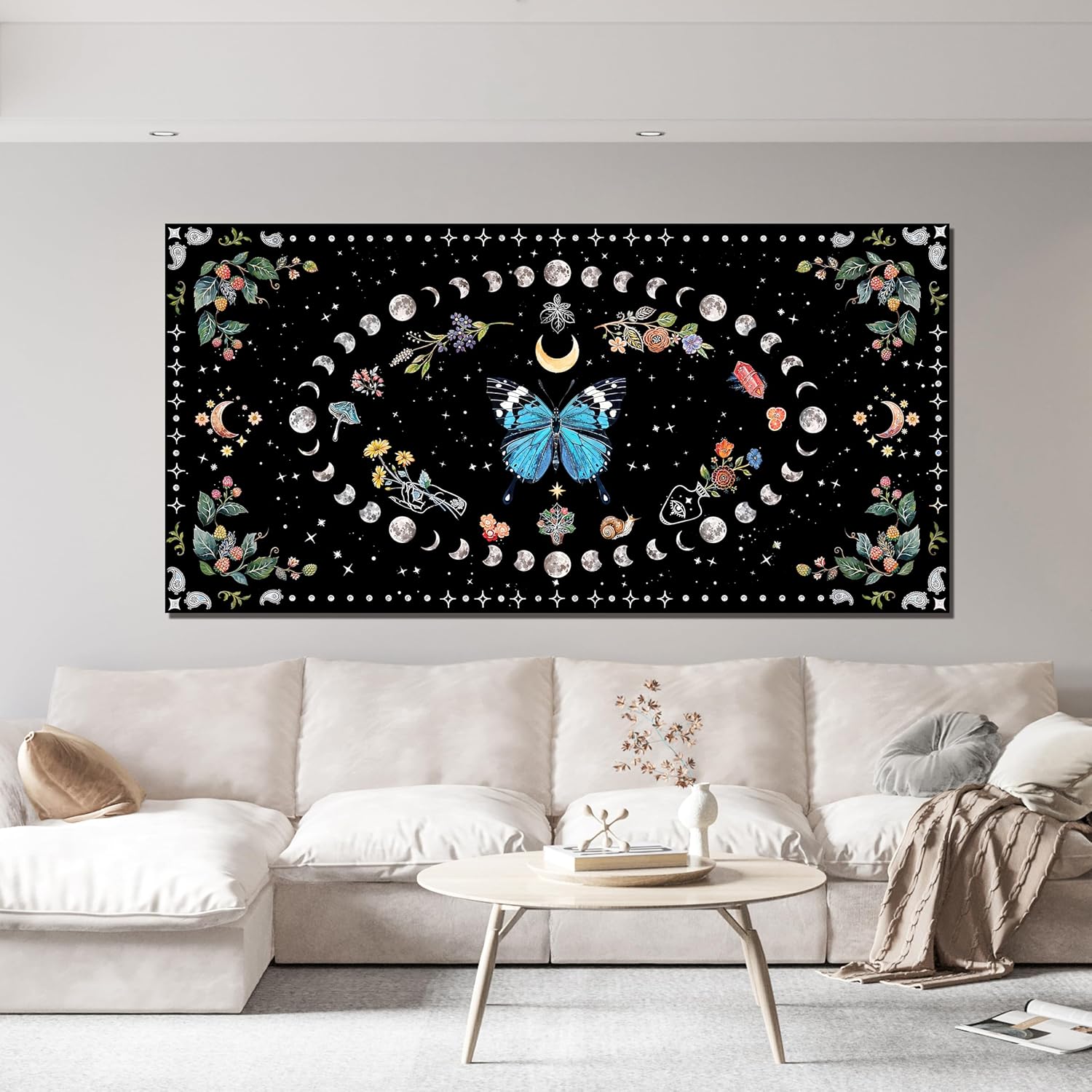 Canvas Wall Art Prints Blue Boho Wall art Decor Abstract Canvas Art Wall Decor Wall Pictures for Living Room Vintage Butterfly Wall Art Moon Flower Large Artwork for Walls Home Room Decor 24"X48"