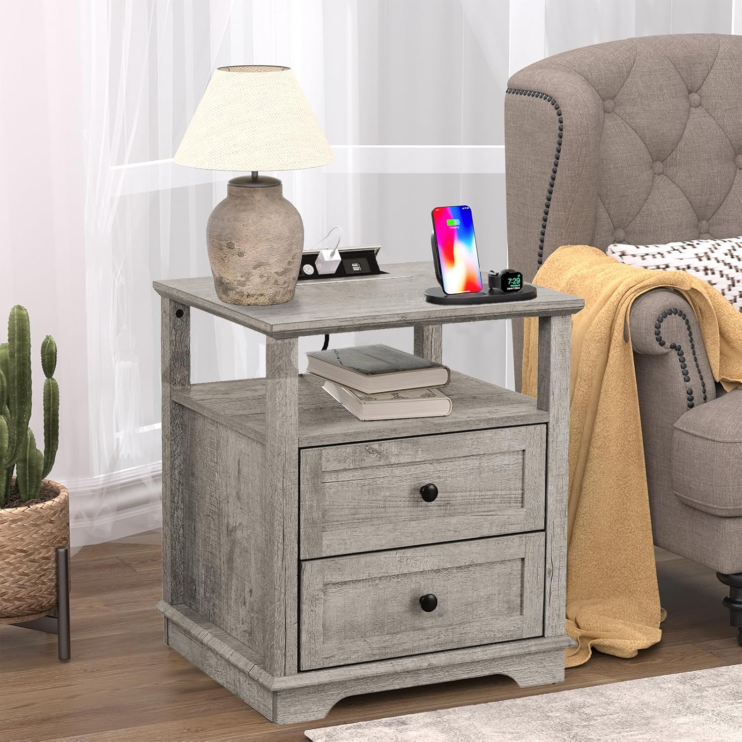HIFYOBRO End Table with 2 Drawers and Charging Station, Type-C & USB Port & Power outlets, Wooden Storage Cabinet, Large Side Table with Storage for Living Room and Bedroom