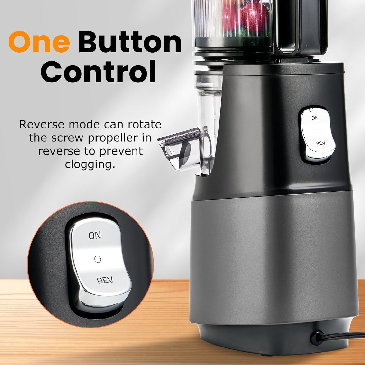 - ăONE BUTTON CONTROLăOne-button design makes your juicing process as simple as possible. There is a reverse mode, if the blockage occurs in the juicing process, just filpping the button can make the juicer rotate in the opposite direction, clear the blockage, and ensure that the juicing is uninterrupted. In the juicing process, if the lid is accidentally opened, the masticating juicer will automatically stop working, and the juicer will not start if the lid is not covered, to ensure the safety of the user