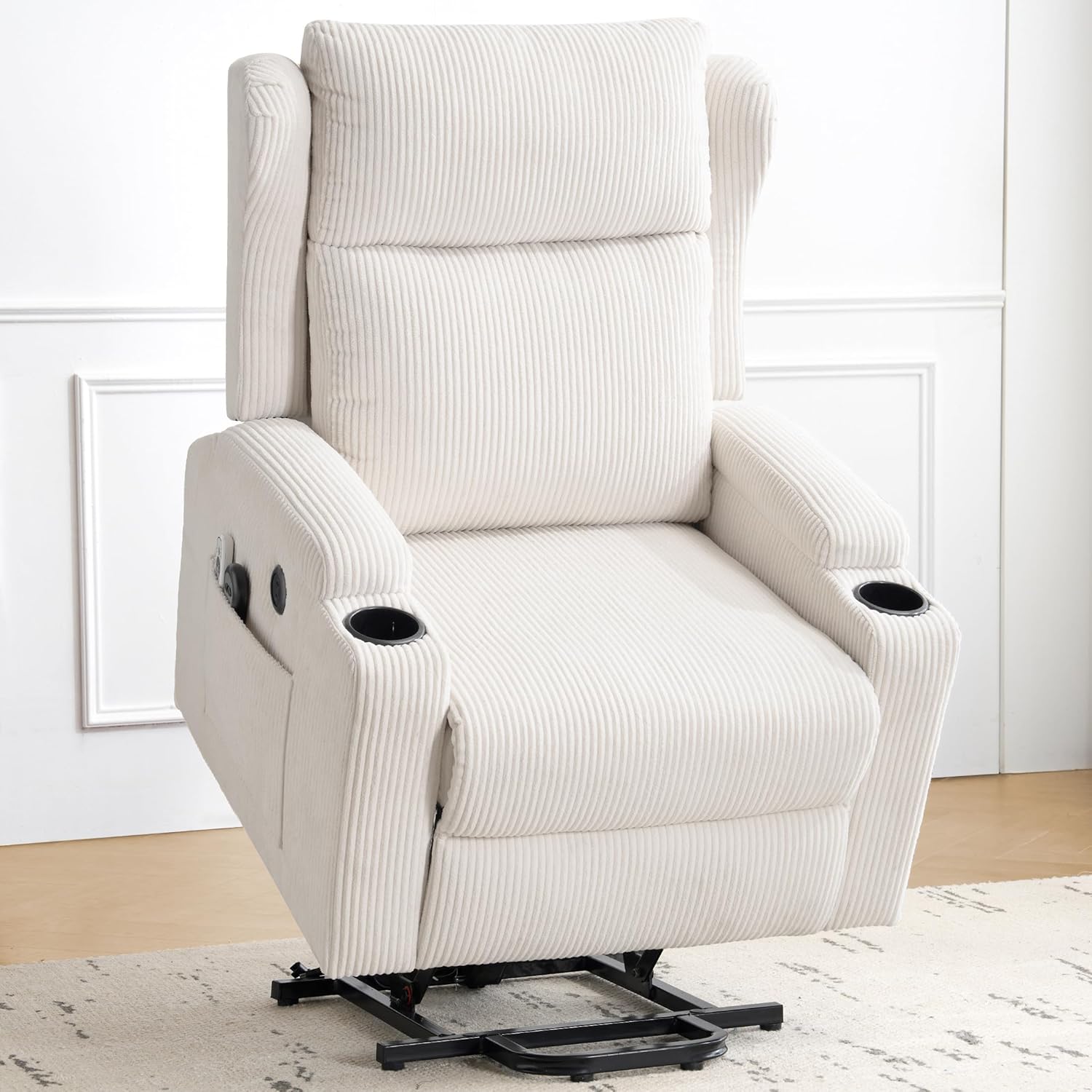 Lift Recliner Chair for Adults with Massage and Heating, Power Lift Recliner Chairs for Elderly, Corduroy Fabric Reclining Chair with USB &Type-C Port, Cup Holders, L6111 (Beige)