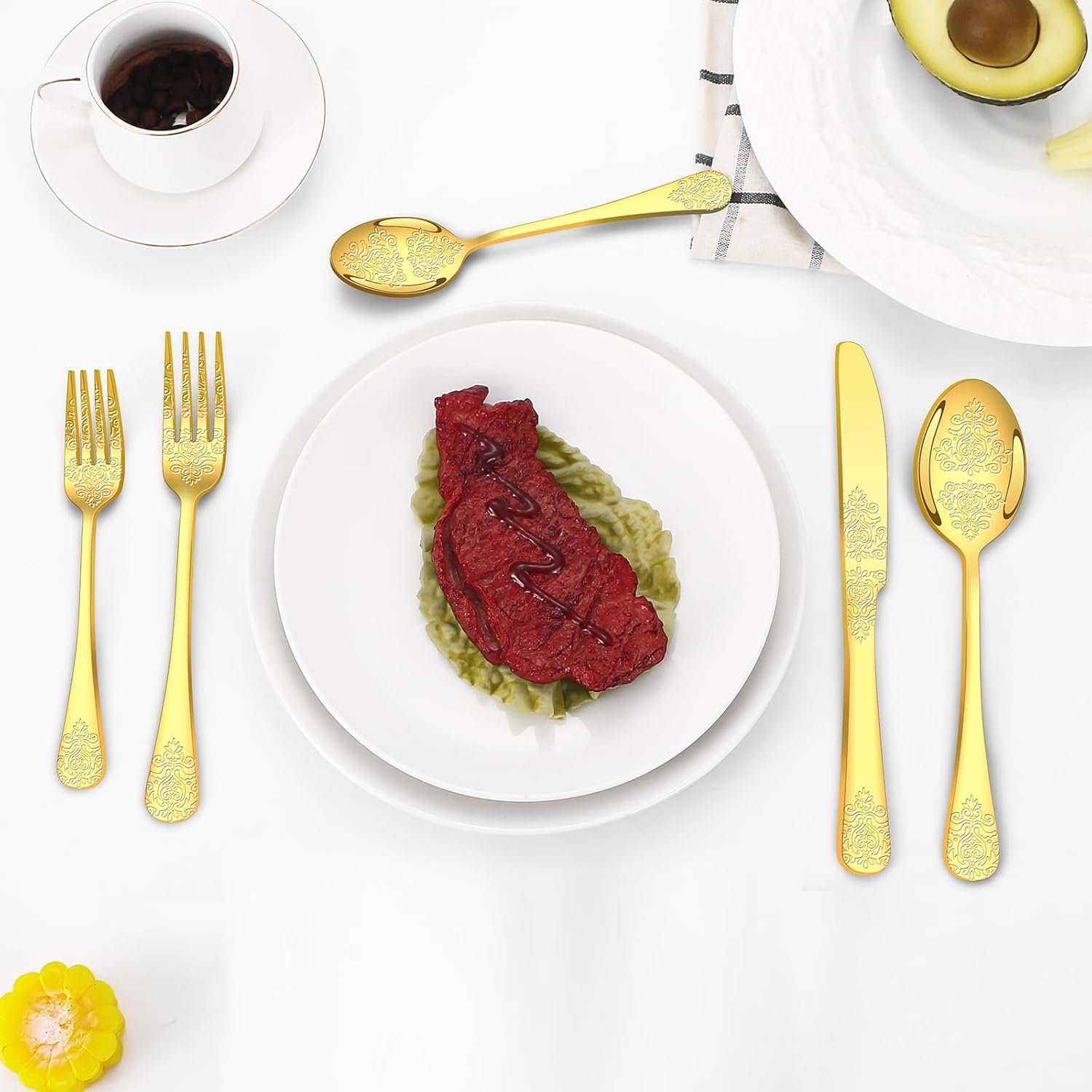 - WONDERFUL WORKMANSHIP AND FUNCTIONAL---Our gold utensils set is made of multiple mirror polishing treatment,gold silverware set with floral design Each piece is beautifully adorned with a delicate floral pattern,edge smooth , elegant and classical appearance, adding to the beautiful experience of everyday dining.