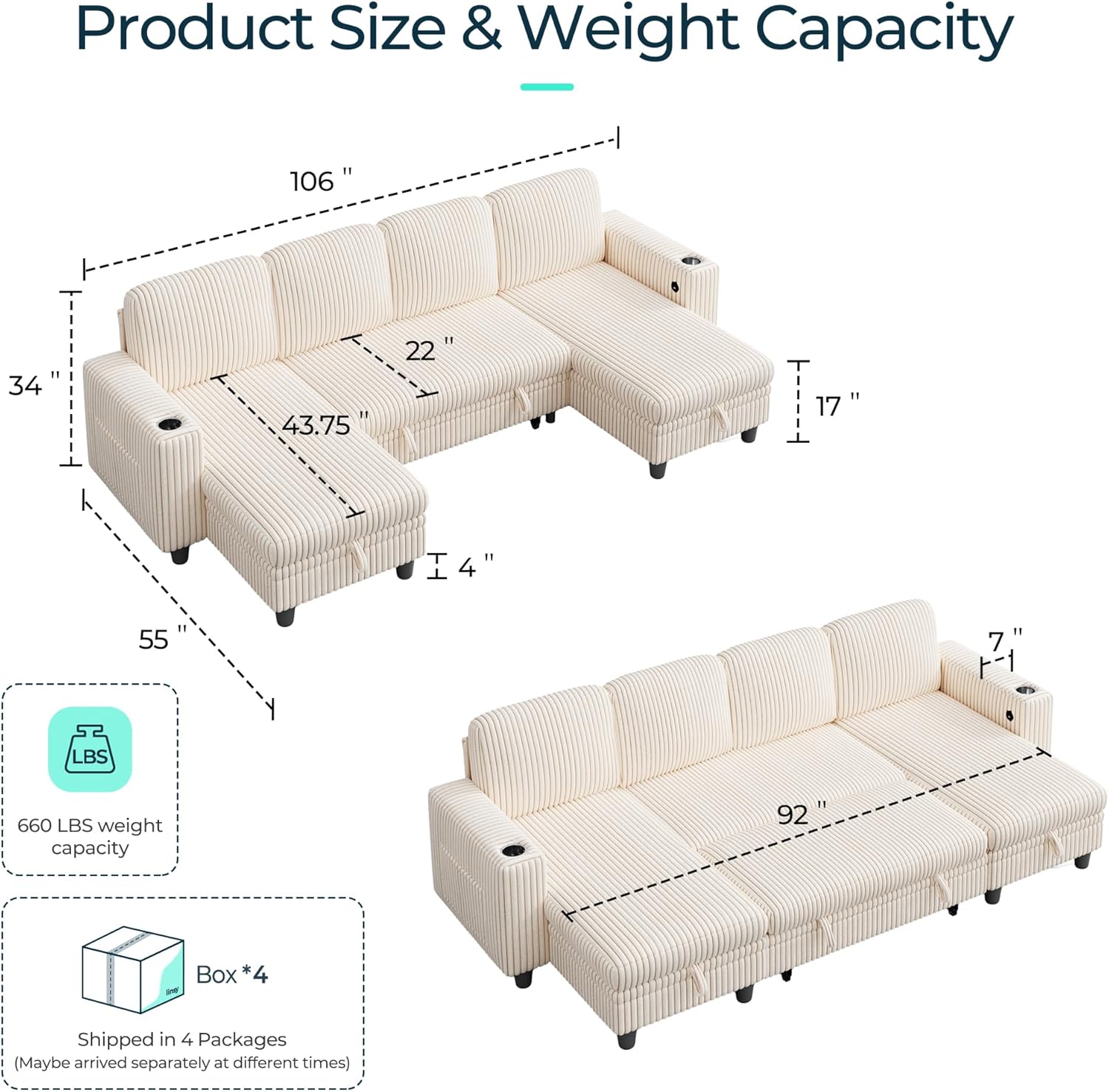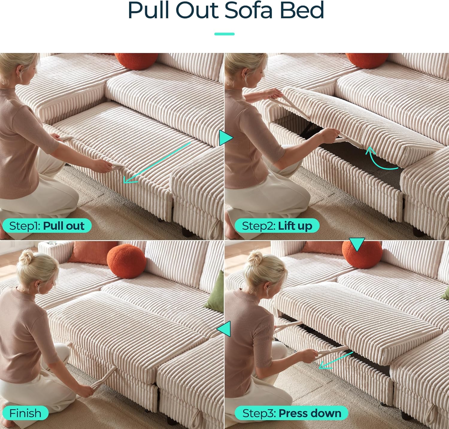 LINSY HOME Sectional Sleeper Sofa with Pull Out Couch Bed - Convertible Plush Corduroy Cloud Couch with Storage Chaise & USB Charging, Comfy U Shaped Modular Couches for Living Room, Beige