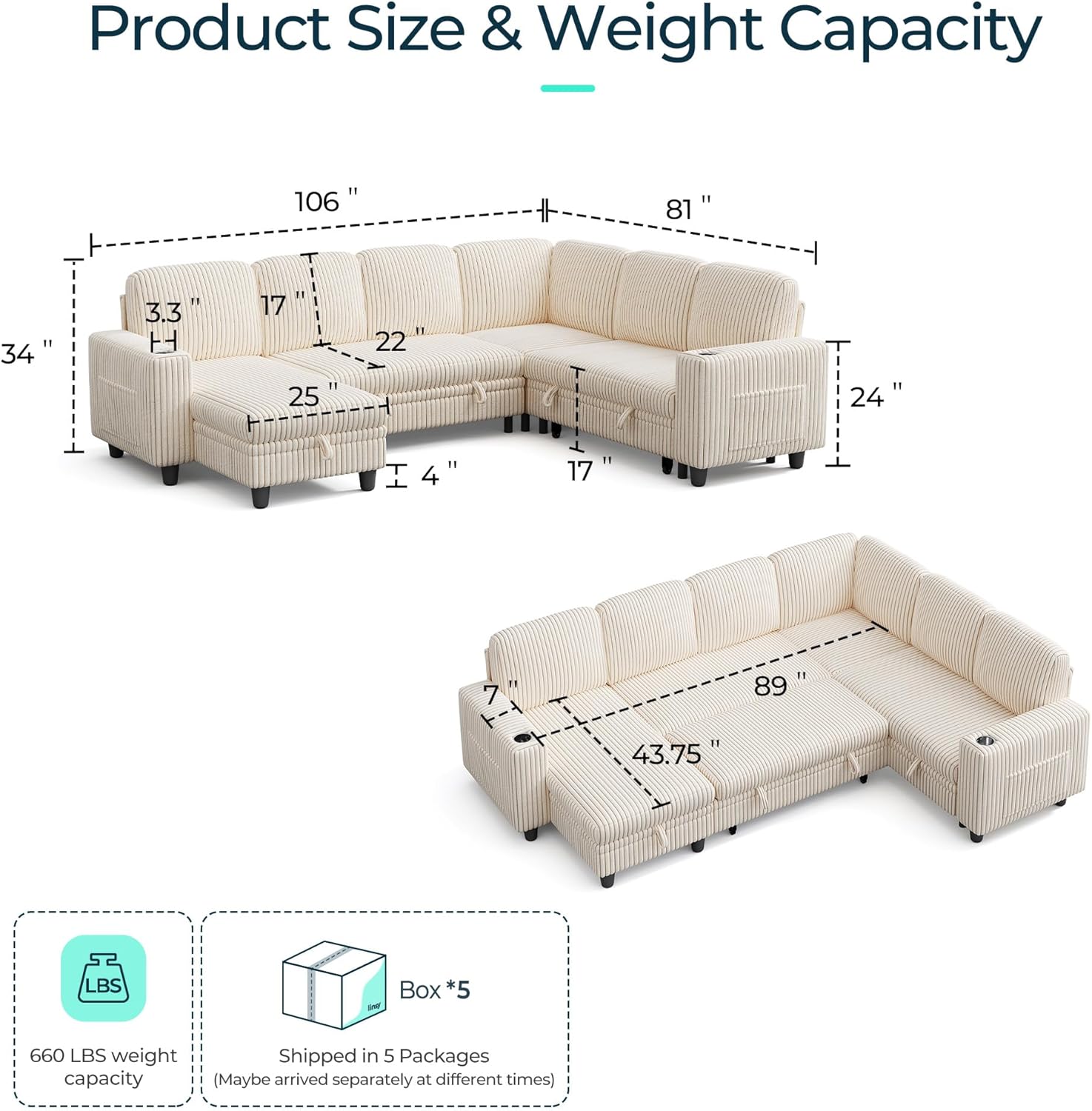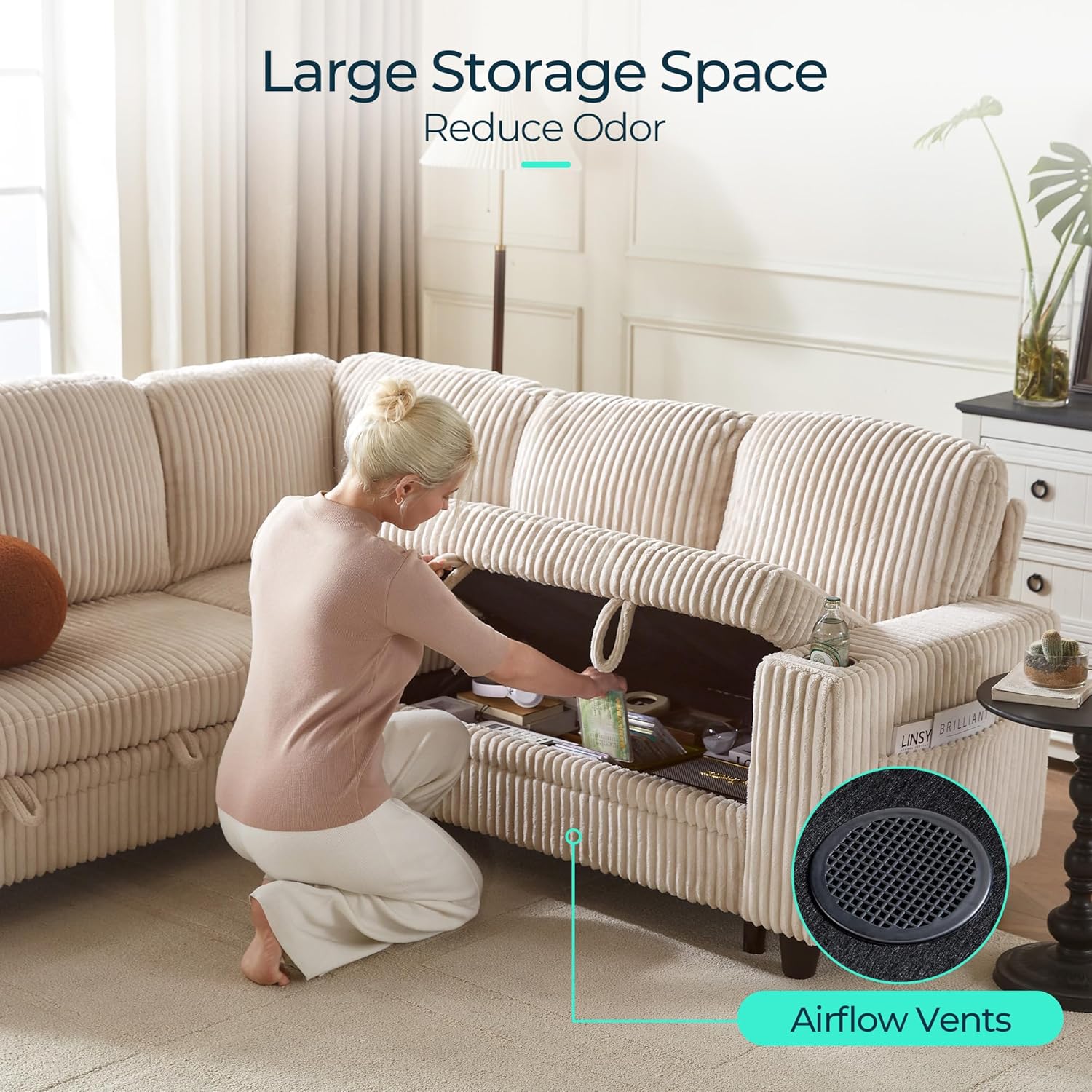 LINSY HOME Sectional Sleeper Sofa with Pull Out Couch Bed - Convertible Plush Corduroy Cloud Couch with Storage Chaise & USB Charging, Comfy Modular Couches for Living Room, Beige