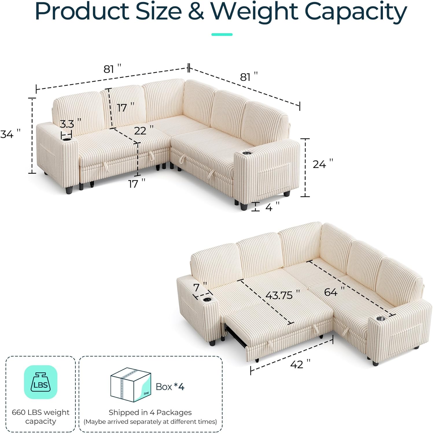 LINSY HOME Sectional Sleeper Sofa with Pull Out Couch Bed - Convertible Plush Corduroy Cloud Couch with Storage Chaise & USB Charging, Comfy L Shaped Modular Couches for Living Room Apartment, Beige