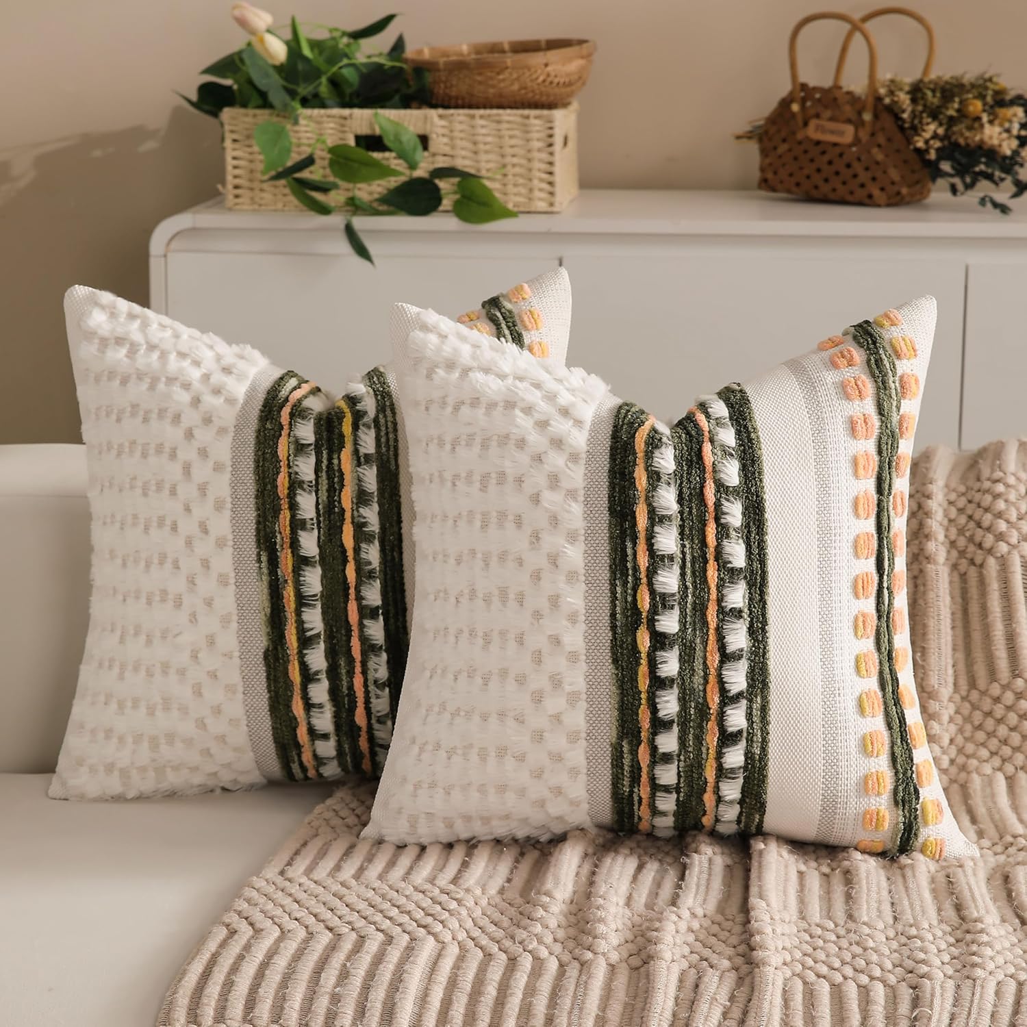 Boho Chenille Tufted Couch Throw Pillow Covers 18x18 Inch Set of 2 Farmhouse Striped Decorative Pillow Covers Accent Neutral Pillowcase Dark Green Cushion Cover for Living Room Sofa Bed