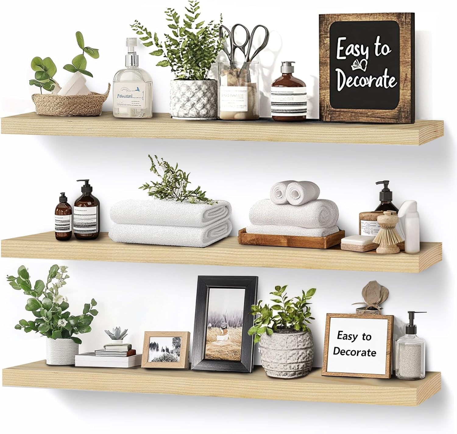 Floating Wall Shelves 3-Pack - 24-Inch Rustic Wooden Shelves for Storage and Décor, Easy Installation for Living Room, Bedroom, and Kitchen