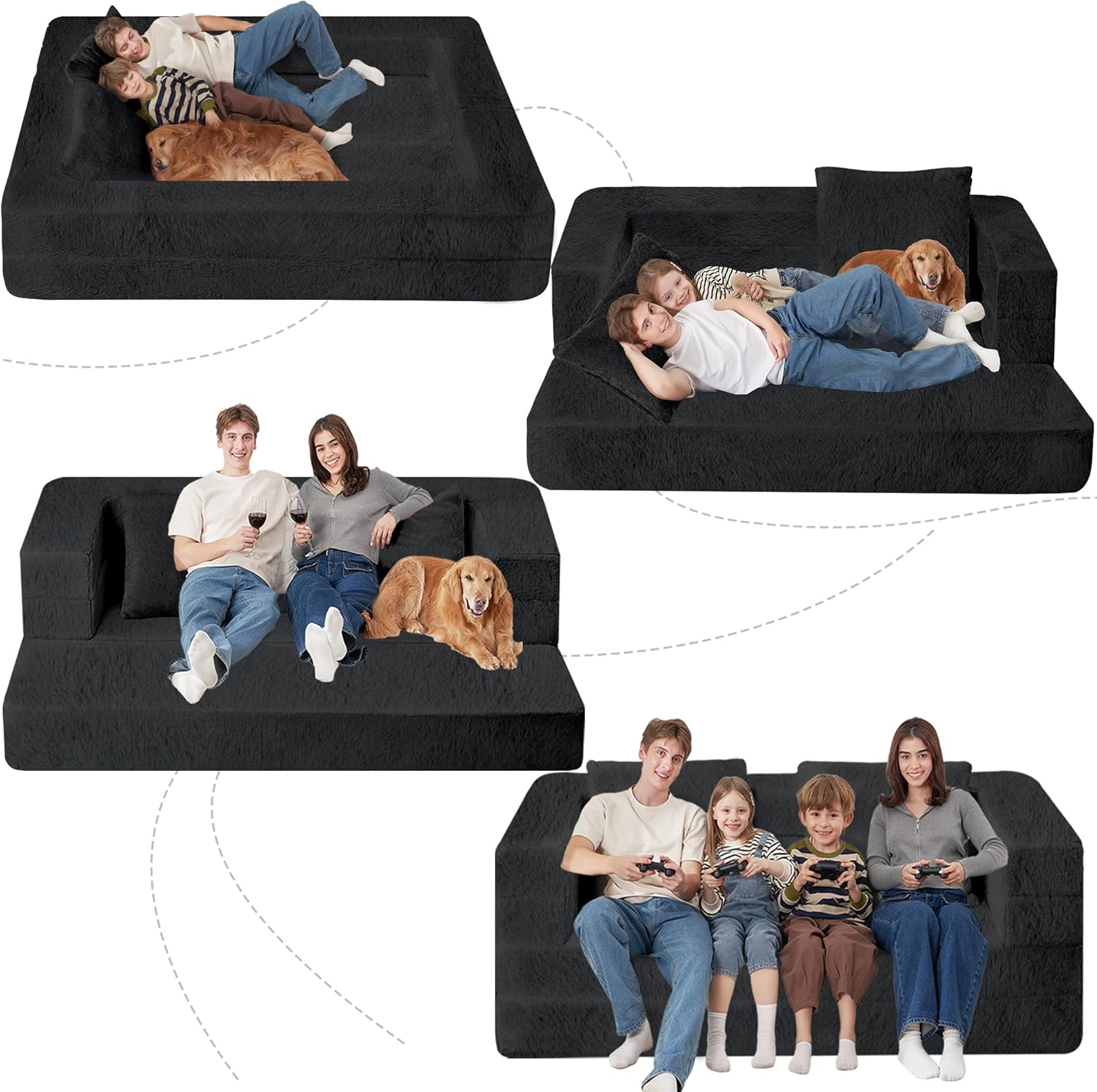 Folding Bean Bag Chair for Adults,3-in-1 Bean Bag Couch Faux Fur Floor Sofa Large Beanbag Convertible Bean Bag Sofa Bed with Pillow in Bedroom,Living Room,Apartment(Queen,Black)