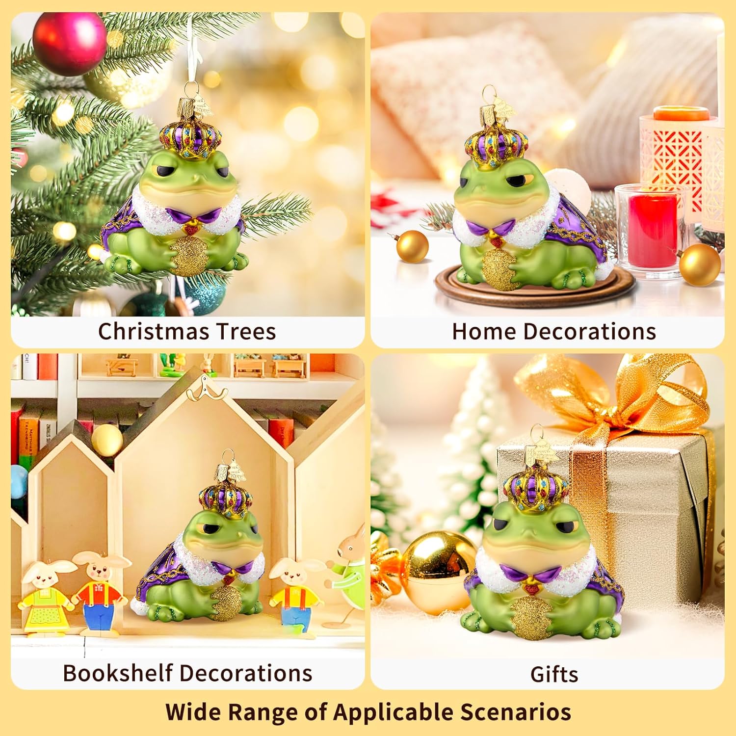 - Exquisite & Unique Design: Our glass Christmas ornament is themed around the image and story of the Frog Prince, with a crown on his head and a shiny purple cloak on his back. He holds a found golden ball in his hand, which is cute and vivid, expressing the beautiful meaning of kindness, honesty, and trustworthiness. The overall design of the frog ornament is purely hand-painted, with exquisite craftsmanship and delicate and vivid imagery. You can decorate any place you want and believe it can blend well