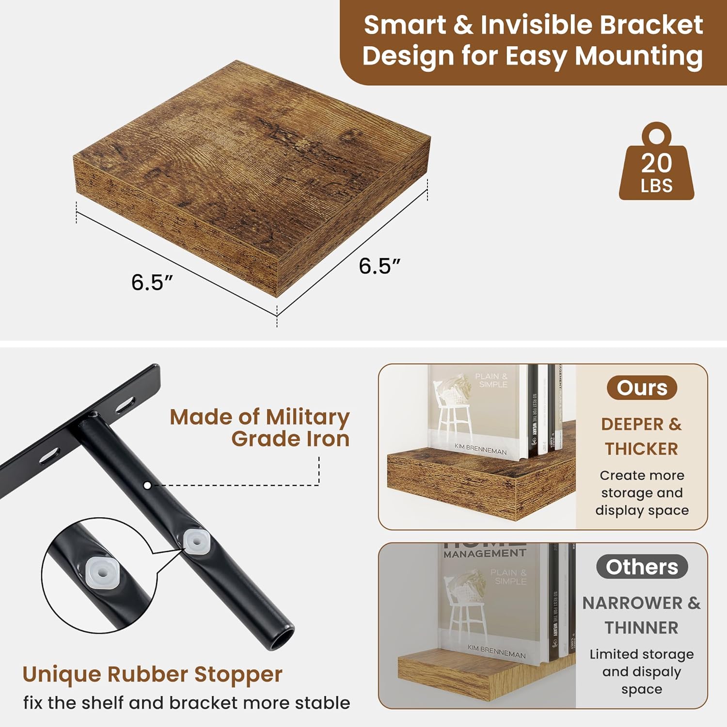 - Well-designed Floating Shelves: Our floating shelves for wall are made of premium engineered wood with a realistic wood grain finish. The rustic wood grain adds warmth and character to any modern or traditional interior. It can organize everyday clutter and make your space tidier, and make it full of aesthetic flare