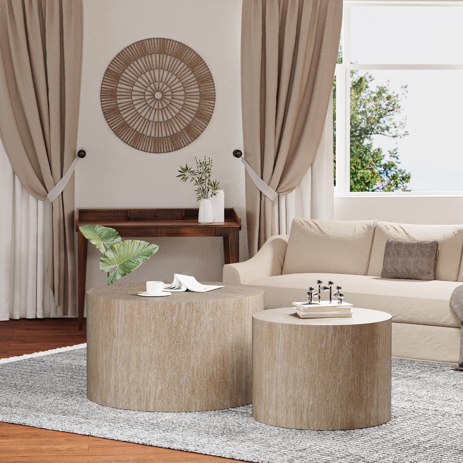 Round Nesting Coffee Table Set of 2 Modern Wood Coffee Tables Handcraft Drum Coffees Table Farmhouse Round Sofa Side Tables End Table for Living Room Small Spaces, No Assembling (Travertine Large)
