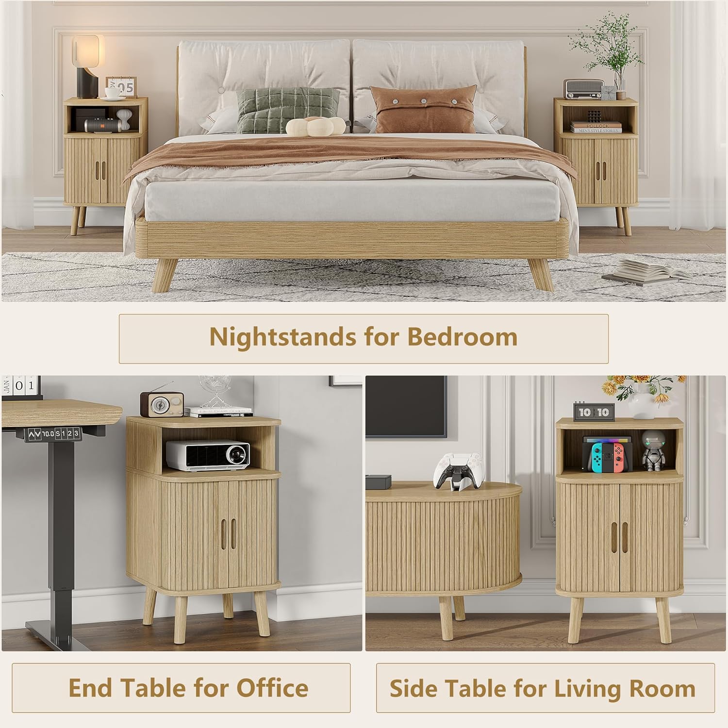 Alohappy Mid Century Modern End Table, Fluted Wood Nightstand with Sliding Tambour Door, Curved Round Edge Side Table with Storage Cabinet for Bedroom, Living Room, Natural Oak