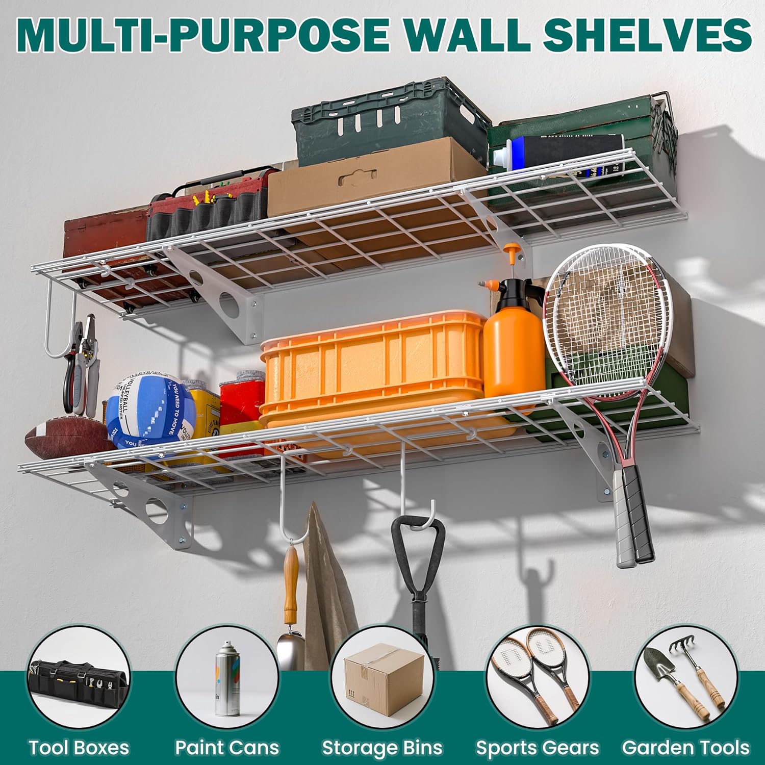 - INCLUDES PREMIUM HOOKS: This wall shelf includes two heavy-duty hooks, each supporting up to 35 lbsâideal for hanging helmets, shovels, backpacks, and more. These hooks add storage flexibility and make your shelf even more functional and efficient