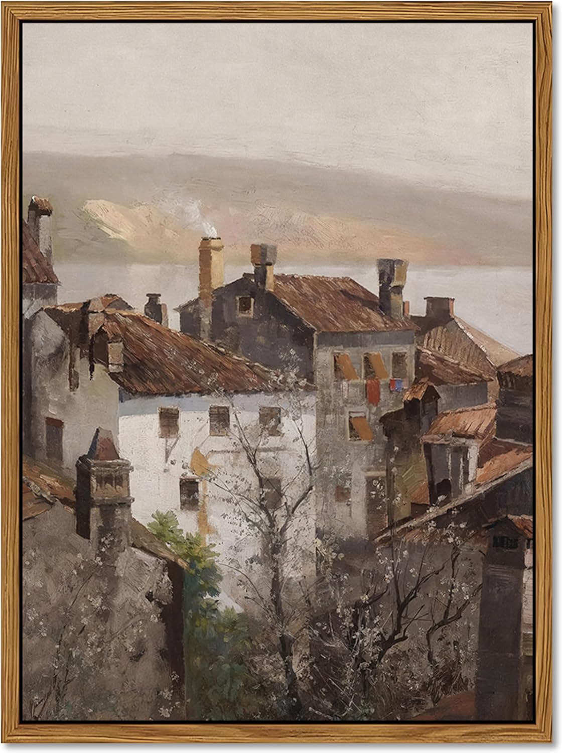 Floating Framed Vintage Canvas Wall Art, European Country Towns Wall Decor Oil Paintings Artwork, Rustic Farmhouse Posters Prints Pictures for Living Room Hallway Bedroom 16x24 inch