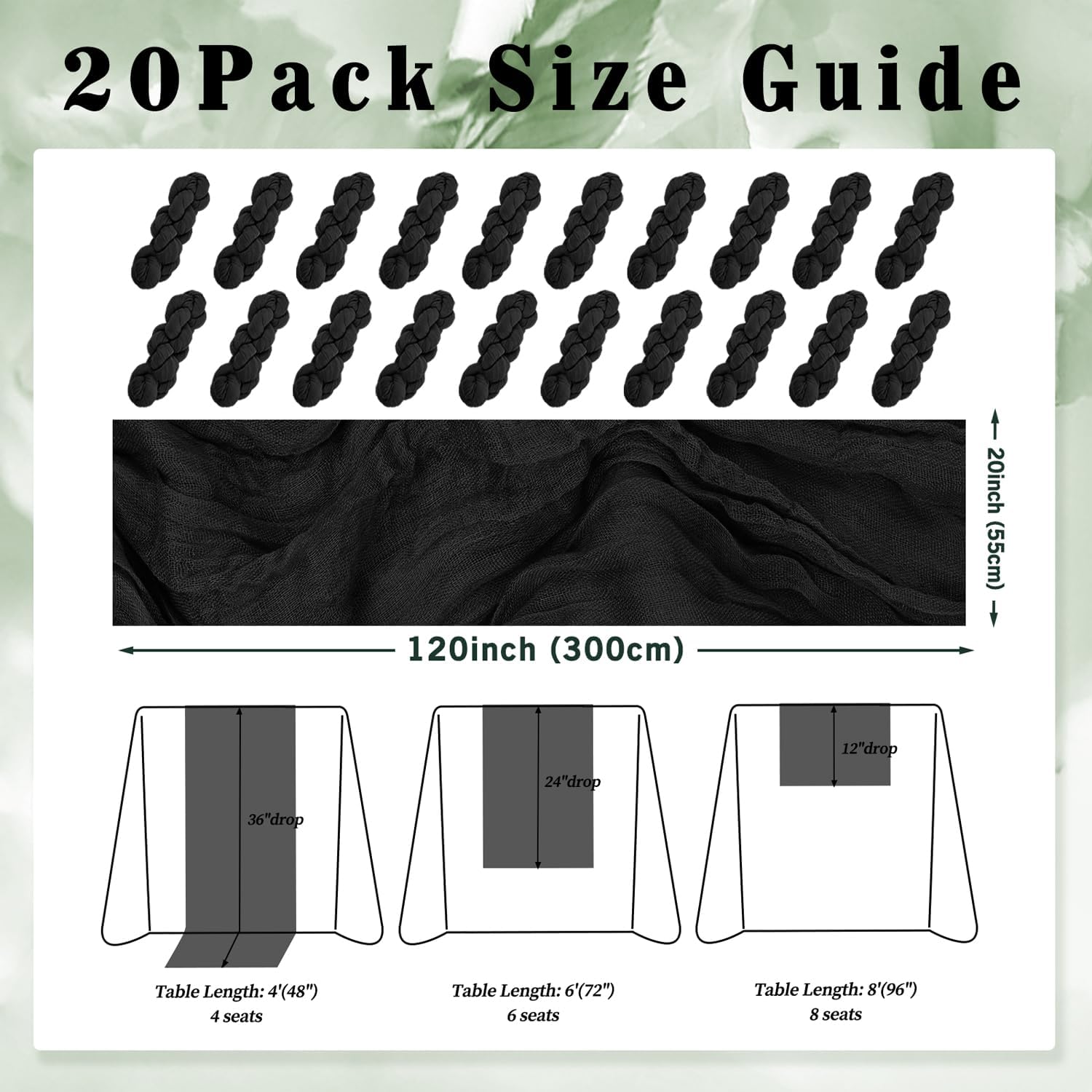 10FT 20 Pack Black Cheesecloth Table Runner 20 x 120 Inch Long Boho Fabric Rustic Cheese Cloth Table Runner for Wedding Bridal Shower Baby Shower Gauze Sheer Birthday Party Table Decorations