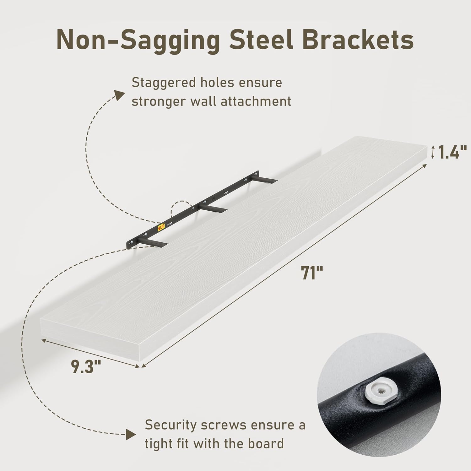 Fun Memories 72 Inch Floating Shelves for Wall 2 Pack Shelves for Bedroom|Kitchen|Bathroom 72 x 9.3 Inch Wood Floating Shelf with Invisible Brackets for Books|Storage|Decor, White