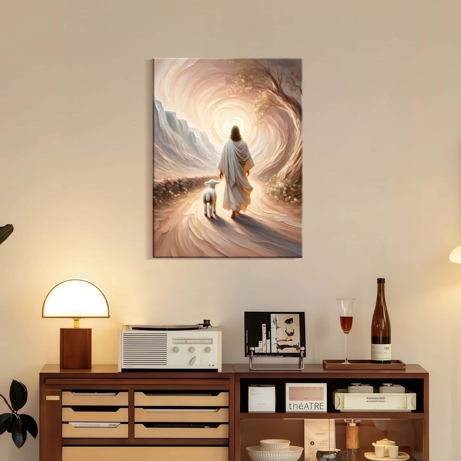 - Inspirational Religious Imagery This canvas wall art features Jesus walking peacefully with a lamb along a divine path, symbolizing guidance, compassion, and spiritual protection. A powerful expression of faith and serenity.