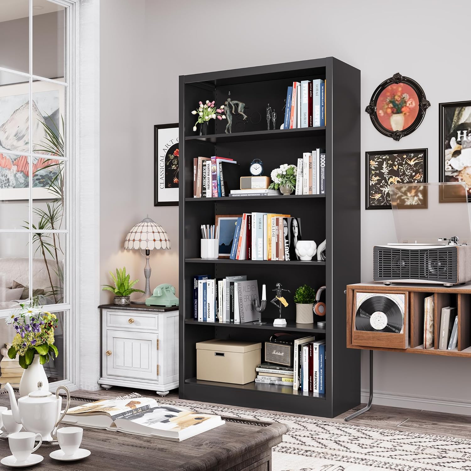 - ăMetal Bookshelves and BookcasesăThe tall bookshelf is stable, sturdy, and durable. Each shelf of metal shelf can support up to 180 pounds without sagging or bending over time. More sturdy and durable than wooden bookcases, does not emit formaldehyde, and has a longer lifespan. Adjustable 5 tier bookshelves can change the size and quantity of storage space. You can safely place large items and hand them over to metal shelves.