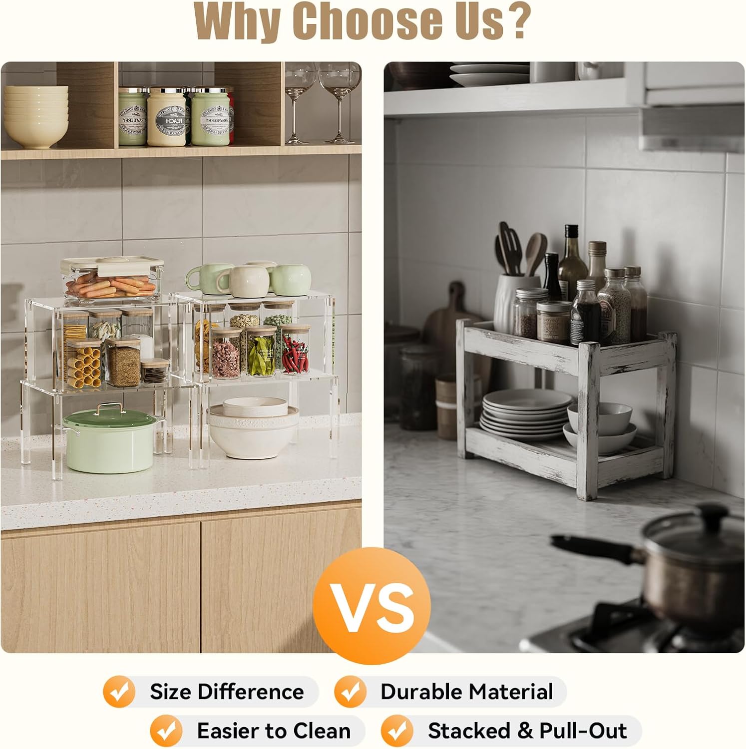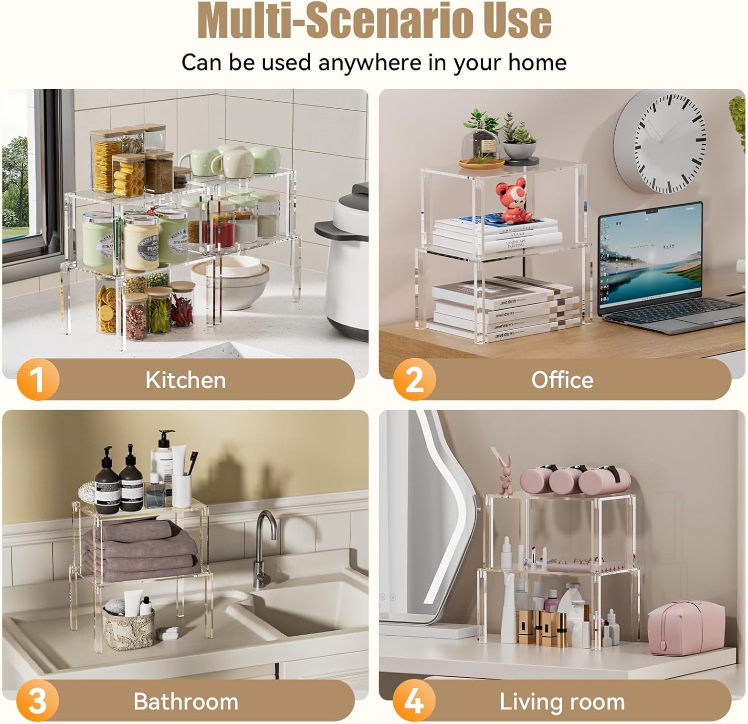 - Maximizes Vertical Space & Organizes Efficiently - Set of 4 acrylic shelves creates dual-layer storage in cabinets, perfectly holding spices, plates, jars, and mugs. Save 50% kitchen space with this counter shelf organizerâkeep essentials visible and neatly displayed!