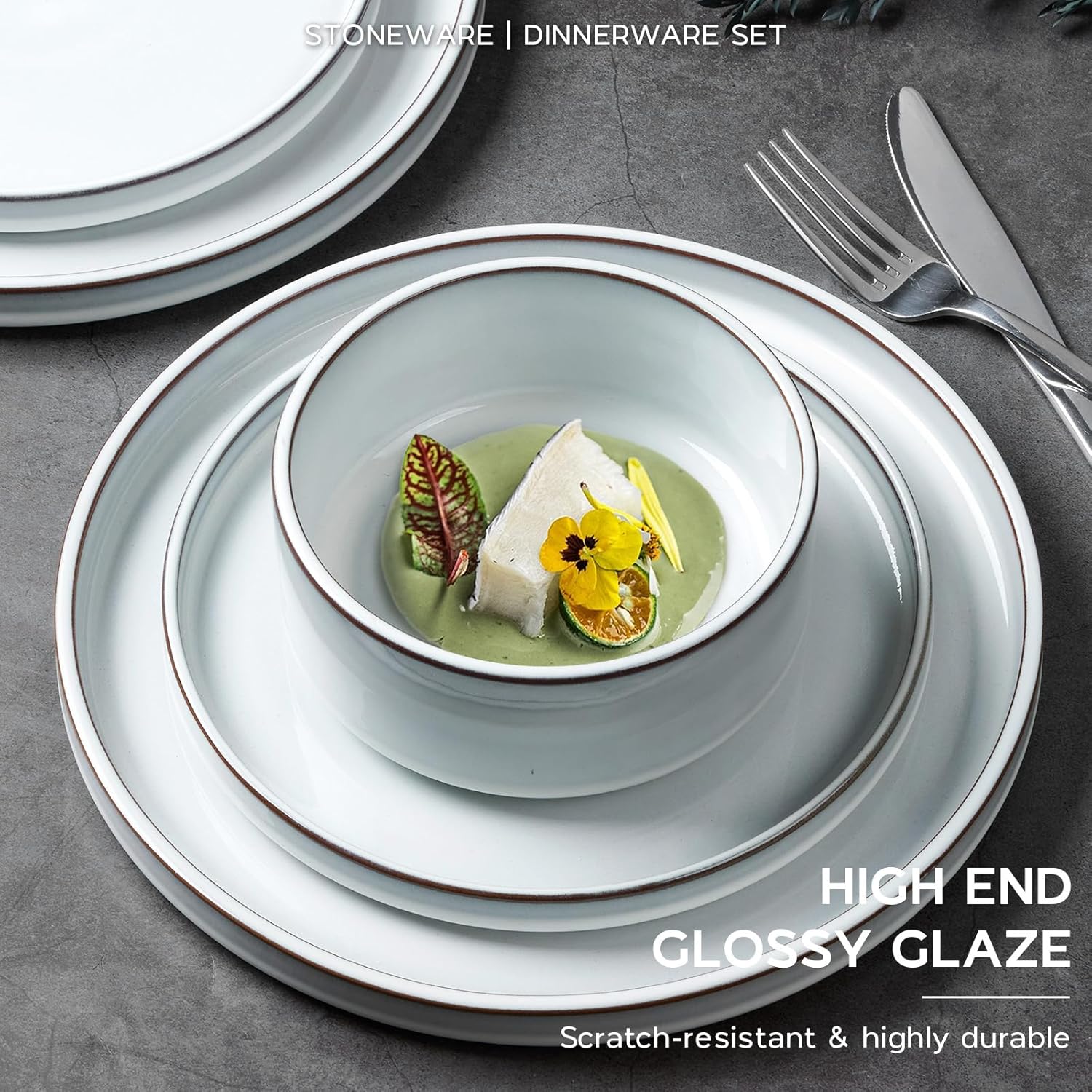 Onader Dinnerware Dishes Sets for 8, Stoneware Plates and Bowls with Unglazed Terracotta Bottom, Ceramic Kitchen Dinner Dish Set, 24 Piece - Glacier White