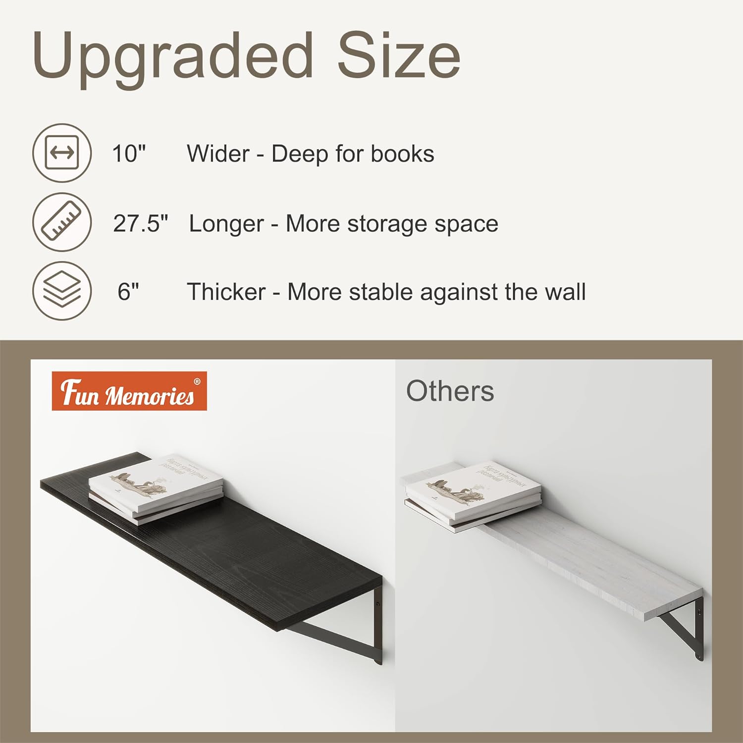 Fun Memories 27.5" W x10 D Floating Shelves, Black Wall Shelf with Brackets, 10 Inch Deep Floating Shelf Set of 2, Large Storage Kitchen Living Room Bathroom Shelves, Wood Wall Mounted Shelf