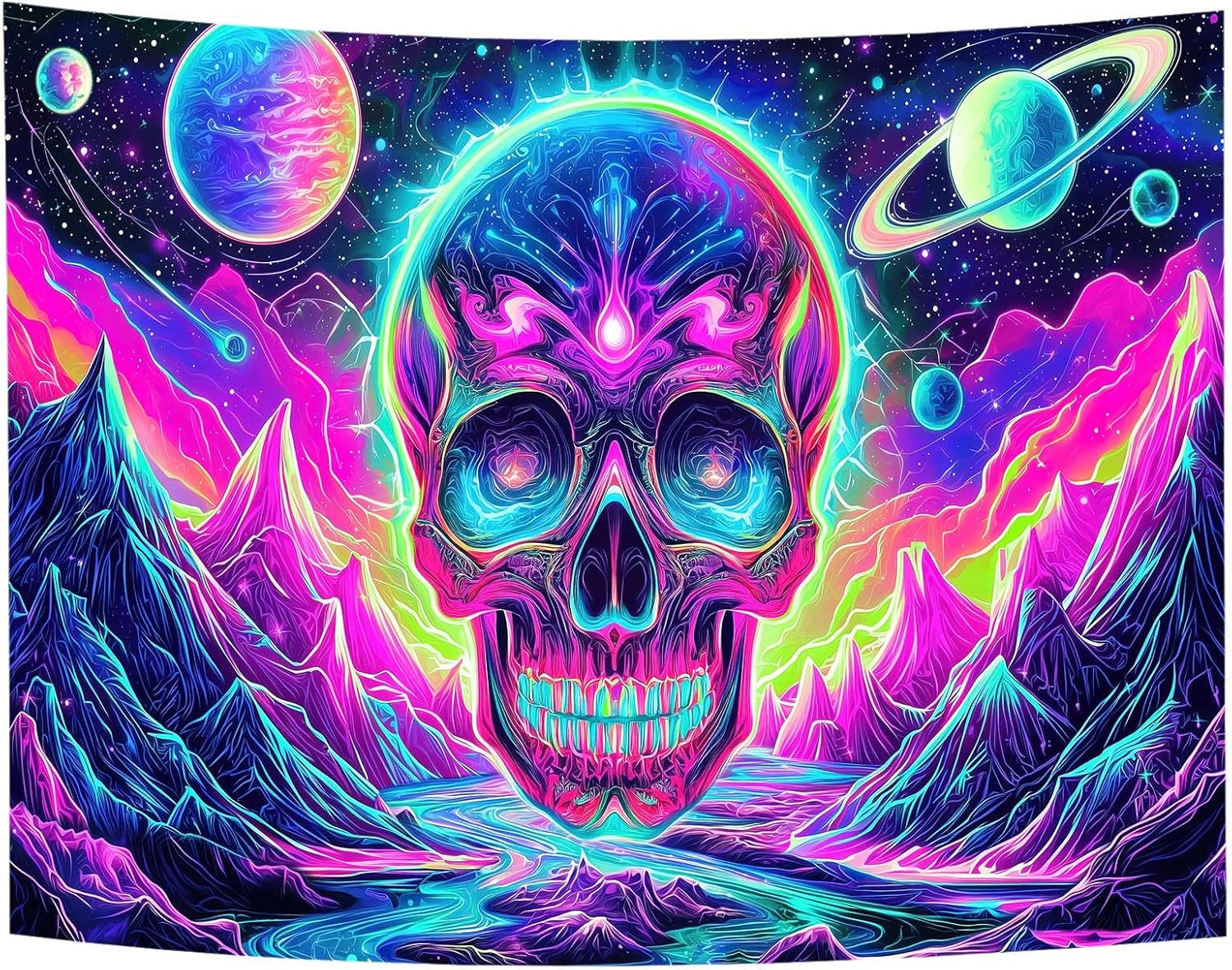 Blacklight Skull Tapestry, UV Reactive Gothic Skeleton Mountain Galaxy Planet Wall Hanging Tapestries, Glow in the Dark Horror Face Halloween Aesthetic Poster for Bedroom Living Room Decor 40X30IN