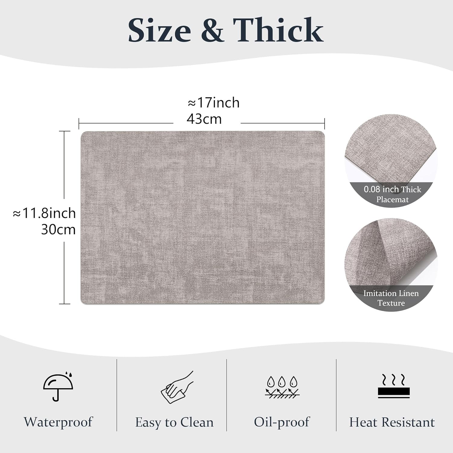 FROMHEART Faux Leather Placemats Set of 6–Waterproof,Heat/Oil Stain-Resistant PU Table Mat–Reversible,Non-Slip,Easy to Clean Place Mats for Kitchen,Dining,Indoor/Outdoor,(Light Grey,11.8" x 17")