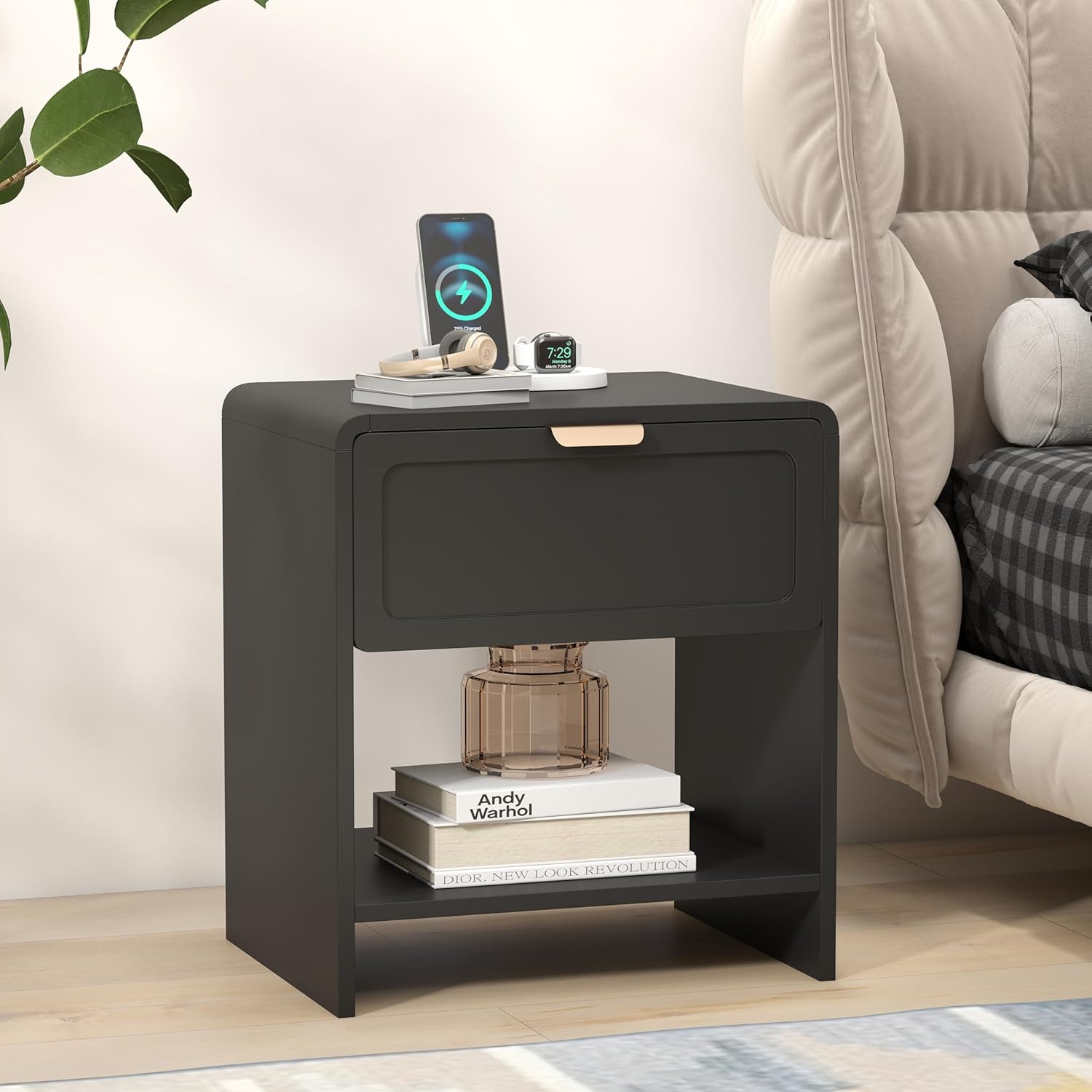 - 【Refined Mid-Century Design】This LEVNARY nightstand features a sleek profile design with curved top corners and a solid-color drawer front, creating a clean and timeless mid-century modern aesthetic perfect for minimalist bedrooms and living rooms.