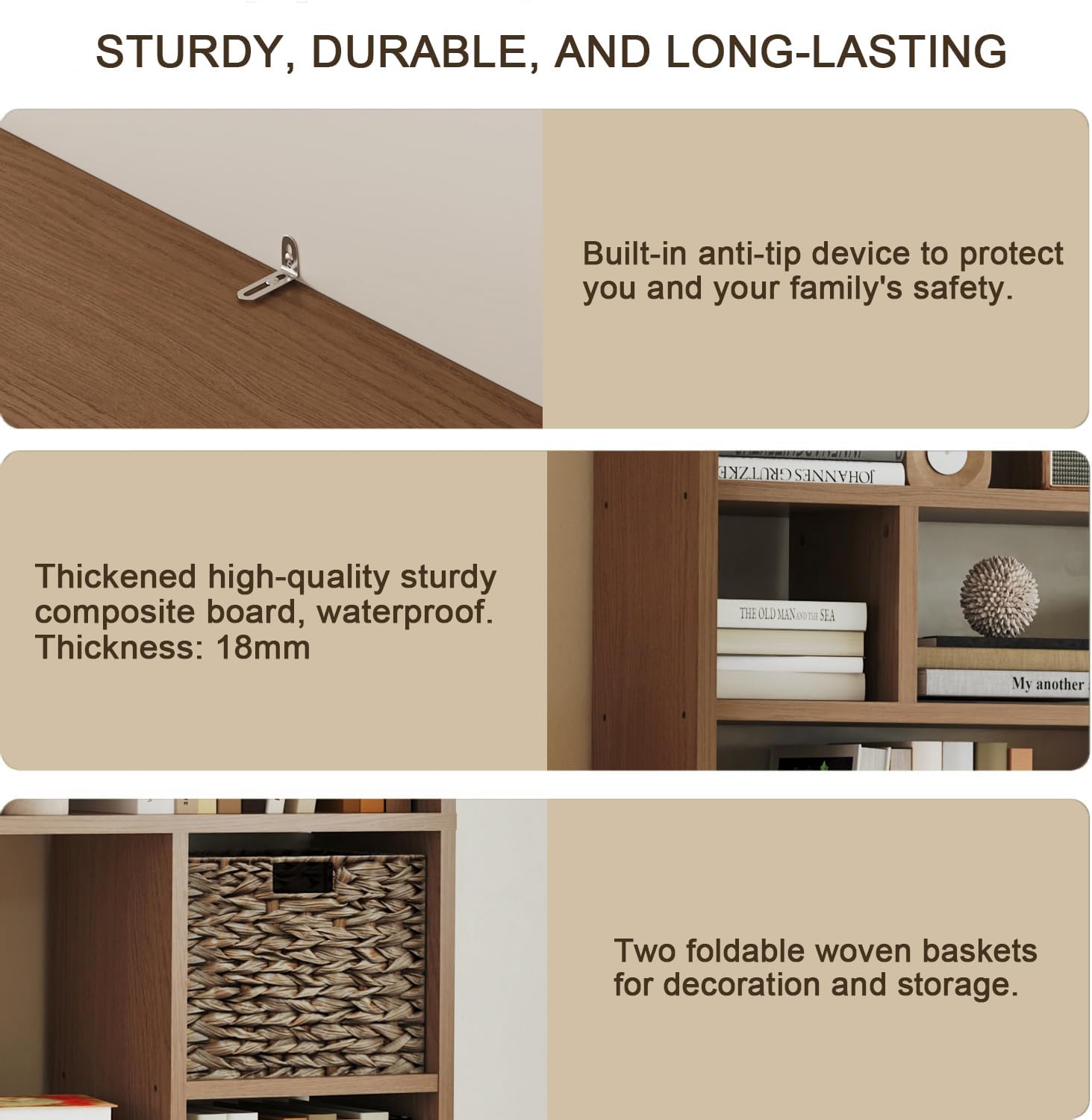 - Safety Anti-Tip Design – Equipped with a metal anchoring bar to secure the bookcase to the wall, preventing accidents and ensuring safety for homes with kids or pets.