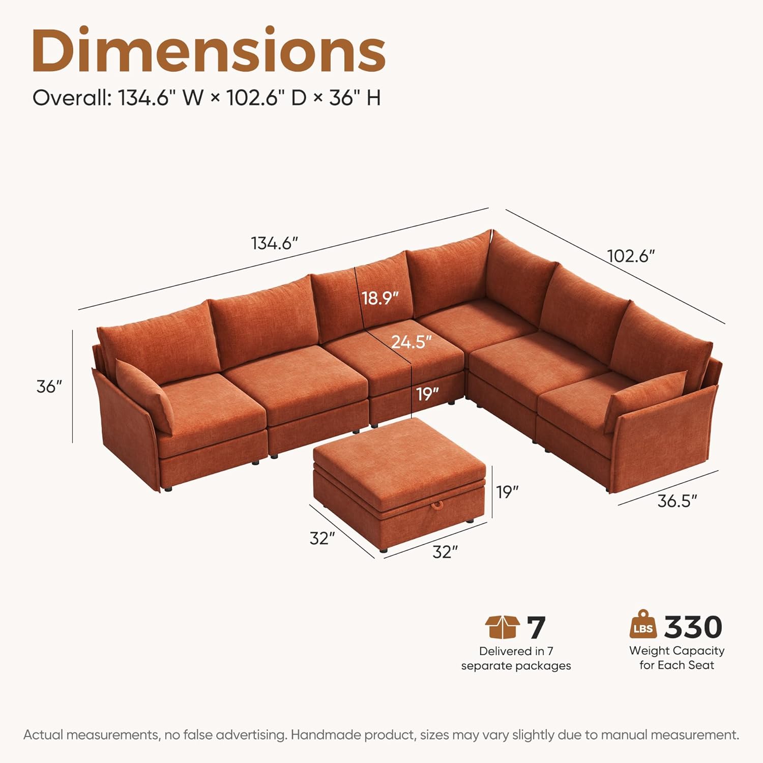 - š” Stylish and Spacious Sectional Sofa - A blend of modern elegance and comfort, this terracotta sofa is ideal for contemporary interiors. Customize seating and shape by adding or removing modules to fit your needs. It's perfect for your living room, family room, bedroom, or office. Overall size: 134.6" W Ć 102.6" D Ć 36" H, seat width: 32", seat depth: 24.5".