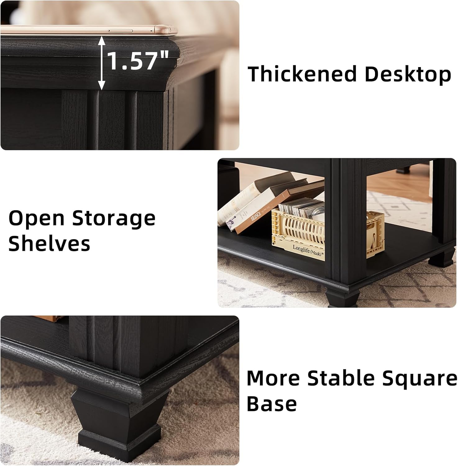 Farmhouse Coffee Tables for Living Room,Square Tea Table with Open Storage Shelf,Large Coffee Table,Rustic Wooden Center Table,Black