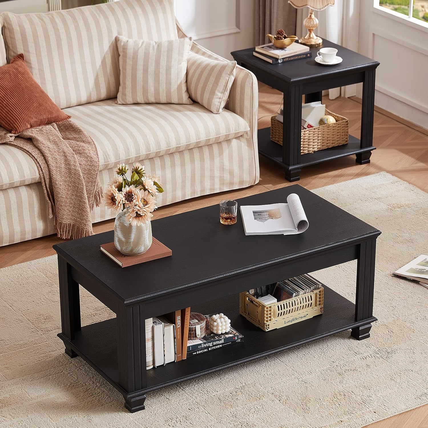 - [Farmhouse Wood Coffee Table] :This black Coffee Table, featuring a vintage textured design paired with an elegant texture, combines farmhouse style with modern style and is the ideal match for your living room furniture.